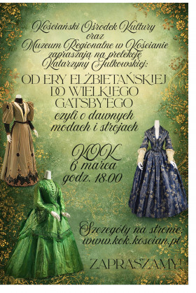 | Miejscowość: Kościan Miejsce: Kościański Ośrodek Kultury Data rozpoczęcia: 06.03.2026 18:00:00 Data zakończenia: 06.03.2026 00:00:00 Organizator: Kościański Ośrodek Kultury Opis wydarzenia: Zapraszamy do Kościański Ośrodek Kultury na niezwykłą podróż przez epoki – od ery elżbietańskiej po czasy „Wielkiego Gatsby’ego”. To wydarzenie dla wszystkich, którzy kochają estetykę dawnych lat, inspirujące opowieści i twórczą atmosferę. W programie prelekcja oraz miniwystawa przygotowana przez Katarzynę Julkowską z Muzeum Regionalnego w Kościanie – o zmieniających się trendach, obyczajach i fascynujących ciekawostkach ze świata mody. Spotkanie zakończy „Przecięcie przy kawie” – warsztat kobiecego kolażu z Martą Hojak. Czas na kreatywność, rozmowę i artystyczne działanie w kameralnym gronie. Spędź z nami inspirujące popołudnie, w którym historia spotyka się ze współczesną sztuką. Koszt biletu 25 zł link poniżej: https://kok-koscian.bilety24.pl/zajecia/?id=3284 |