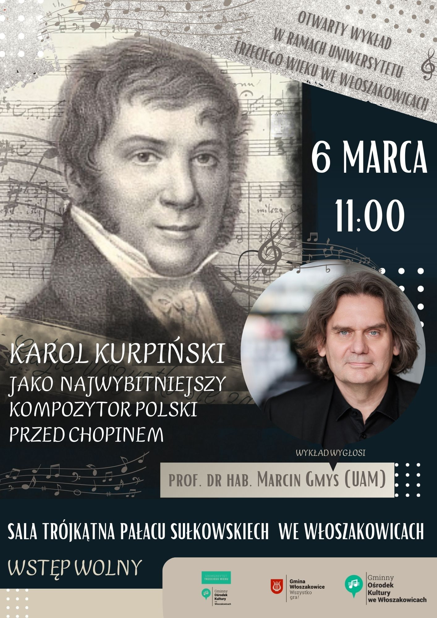 | Miejscowość: Włoszakowice Miejsce: Sala Trójkątna pałacu Sułkowskich Data rozpoczęcia: 06.03.2026 11:00:00 Data zakończenia: 06.03.2026 12:30:00 Organizator: Gminny Ośrodek Kultury we Włoszakowicach Opis wydarzenia: Gminny Ośrodek Kultury we Włoszakowicach zaprasza na otwarty wykład wybitnego muzykologa prof. dr. hab. Marcina Gmysa z Uniwersytetu im. Adama Mickiewicza w Poznaniu pt. „Karol Kurpiński jako najwybitniejszy kompozytor polski przed Chopinem”. Odbędzie się on w 241. rocznicę urodzin kompozytora – 6 marca o godz. 11.00 w Sali Trójkątnej Pałacu Sułkowskich. Wstęp wolny. Marcin Gmys w zeszłym roku otrzymał tytuł Mistrza Mowy Polskiej. Wcześniej był redaktorem naczelnym Polskiego Radia Chopin i jest autorem nagradzanych publikacji z zakresu historii i estetyki muzyki. W książce Karol Kurpiński i romantyczna Europa postawił i uzasadnił tezę, że Kurpiński był najwybitniejszym polskim kompozytorem epoki przed pojawieniem się geniuszu Fryderyka Chopina. W piątek, 6 marca, o najsłynniejszym Włoszakowiczaninie będzie można posłuchać w miejscu, gdzie pamięć o nim jest wciąż żywa – jak nigdzie indziej. Wykład odbędzie się w ramach Uniwersytetu Trzeciego Wieku we Włoszakowicach, ale będzie miał charakter otwarty. Tego samego dnia, o godz. 17.00, w Izbie Regionalnej GOK odbędzie się wernisaż wystawy „Karol Kurpiński. Kultura nie robi się sama”. |