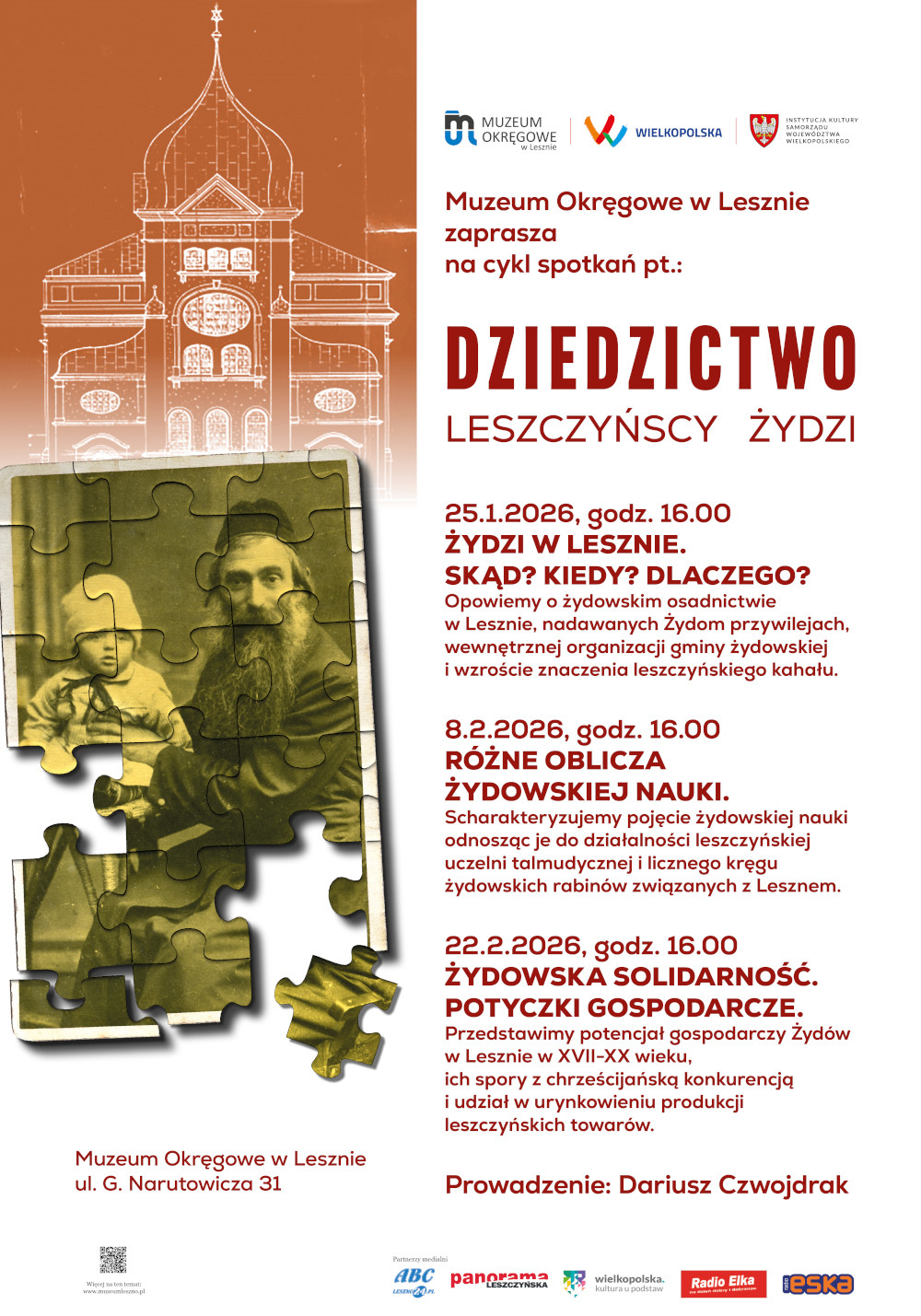 | Miejscowość: Leszno Miejsce: Muzeum Okręgowe w Lesznie, ul. G. Narutowicza 31 Data rozpoczęcia: 22.02.2026 16:00:00 Data zakończenia: 22.02.2026 17:00:00 Organizator: Muzeum Okręgowe w Lesznie Opis wydarzenia: 22 lutego 2026, godz. 16.00 – „Żydowska solidarność. Potyczki gospodarcze” Przedstawimy potencjał gospodarczy Żydów w Lesznie w XVII–XX wieku, ich spory z chrześcijańską konkurencją oraz udział w urynkowieniu produkcji leszczyńskich towarów. Miejsce: Muzeum Okręgowe w Lesznie, ul. G. Narutowicza 31 Kontakt: 65 529 61 40 w. 3 Obowiązuje wykupienie biletu wstępu. Zachęcamy do zapoznania się z regulaminem zwiedzania Muzeum. |