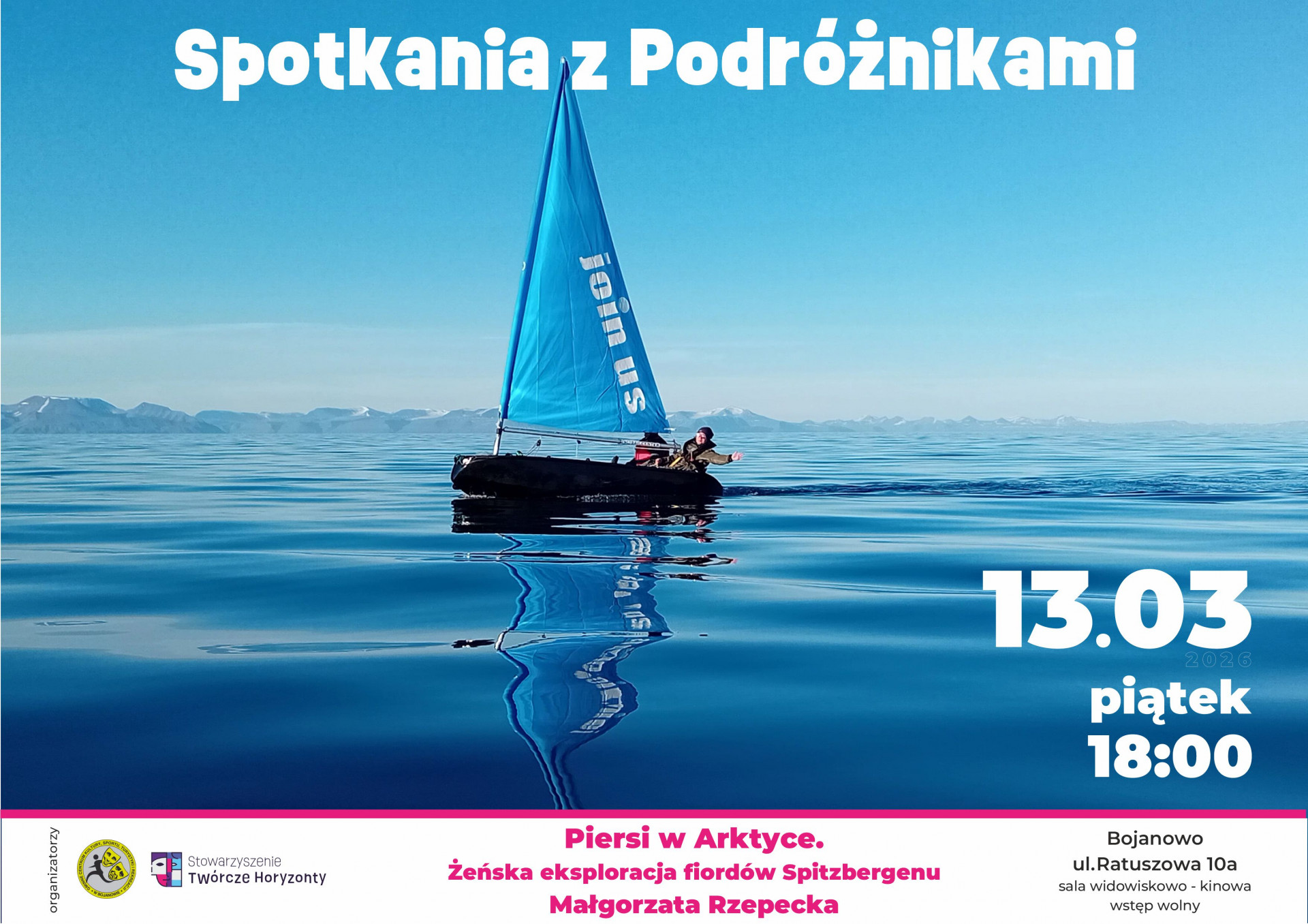 | Miejscowość: Bojanowo Miejsce: Gminne Centrum Kultury w Bojanowie ul. Ratuszowa 10 A Data rozpoczęcia: 13.03.2026 18:00:00 Data zakończenia: 13.03.2026 19:00:00 Organizator: Gminne Centrum Kultury, Sportu, Turystyki i Rekreacji w Bojanowie oraz Stowarzyszenie Twórcze Horyzonty Opis wydarzenia: W dniach 15 – 27 lipca udało nam się zrealizować rejs dwoma małymi (ok. 3 metrowymi) otwarto kadłubowymi, żaglowymi łódkami, wspomaganymi niewielkimi silnikami zaburtowymi. Eksplorowałyśmy północną część Isfjordu na Spitsbergenie, a dokładnie Ekmanfjord i Dicksonfjord. Obsadę dwóch łódek stanowiłyśmy my, czyli cztery szalone kobiety – Małgorzata Rzepecka, Anna Wierzbicka, Joanna Plenzler, Wiktoria Parzych. Płynęłyśmy w składach dwuosobowych, wioząc ze sobą wszystkie niezbędne do dwutygodniowego przeżycia elementy (okrojone do minimum ze względu na bardzo ograniczoną ilość miejsca), w tym: elektronikę i mapy do nawigacji na morzu i lądzie, wyposażenie obozów czyli namioty, śpiwory, itp.., żywność i coś co nazywałyśmy szumnie „kuchnią” oraz niezbędnik naprawczy i serwisowy do łódek, silników i żagli. W tym wszystkim udało nam się nawet upchnąć zestawy malarskie i rysunkowe czyli farby i szkicowniki oraz sprzęt tzw. „rozrywkowy” czyli krzyżówki i sudoku, bo przecież wyprawa odbywała się w ramach naszego urlopu i w momentach, kiedy nie walczyłyśmy o życie, nazywana była przez nas „wakacjami nad morzem”. Sama wyprawa zajęła prawie dwa tygodnie, w trakcie których pokonałyśmy ok. 140 kilometrów po wodzie i lądzie, ale poprzedzona był wielomiesięcznymi przygotowaniami związanymi z opracowaniem trasy, zdobyciem i zakupem niezbędnego wyposażenia i sprzętu. Łódki powstały również w ostatnich miesiącach i niemal do ostatniej chwili były jeszcze testowane i poprawiane. Wybór tych dwóch fiordów był nieprzypadkowy. Rzadko wpływają tam jachty morskie, są one słabo zeksplorowane i niewiele jest na ich temat szczegółowych informacji. Szansa, że spotkamy tam kogokolwiek była bardzo nikła i dzięki temu wydały nam się niezwykle kuszące. Chciałyśmy, żeby była to wyprawa w zupełną dzicz, gdzie będziemy mogły obcować z nieskażoną przez obecność człowieka przyrodą i cieszyć się z wakacyjnego dreszczyku emocji odkrywając nieznane. Zaplanowaną przez nas trasę udało się zrealizować w 100%, a nawet w 120%, bo finalnie udało nam się dopłynąć o własnych siłach do Longyearbyen, pokonując Isfjord. |