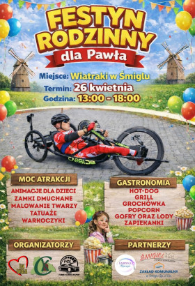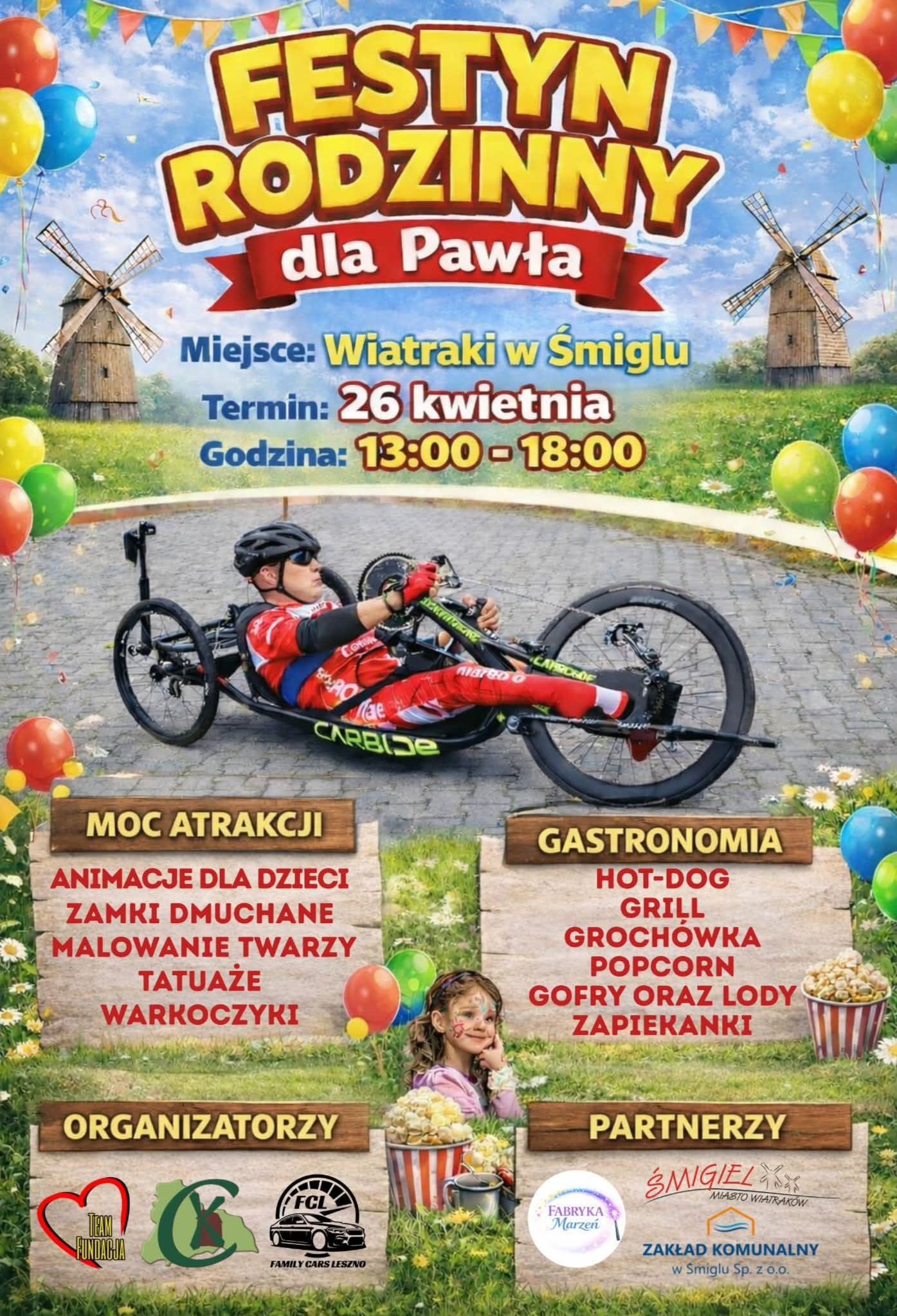 | Miejscowość: Śmigiel Miejsce: Wiatraki Data rozpoczęcia: 26.04.2026 13:00:00 Data zakończenia: 26.04.2026 18:00:00 Organizator: Team Fundacja, Family Cars Leszno, Centrum Kultury w Śmiglu Opis wydarzenia: Wspieramy Pawła Balcerowiaka w drodze po sportowe marzenia! Jako organizatorzy wydarzenia chcemy przedstawić Wam historię człowieka, który każdego dnia udowadnia, że nie ma rzeczy niemożliwych. Paweł Balcerowiak, 37-letni zawodnik parakolarstwa, od urodzenia porusza się na wózku. Nie przeszkodziło mu to jednak w odnalezieniu swojej pasji i w walce o sportowe cele na najwyższym poziomie. Na handbike’u spędza setki godzin rocznie. Trenuje na szosach, pokonuje wymagające górskie podjazdy, bierze udział w obozach sportowych i startuje w zawodach w całej Polsce. Każdy trening to ogromny wysiłek, determinacja i konsekwencja w dążeniu do celu. W ubiegłym roku Paweł wystartował w Mistrzostwach Polski, gdzie w jeździe na czas poprawił swój wynik z poprzedniego sezonu. To dowód ciężkiej pracy i systematycznego rozwoju. Choć wyścig wspólny zakończył się pechowo po wypadnięciu z trasy, nie podcięło mu to skrzydeł – wręcz przeciwnie, jeszcze bardziej zmotywowało do dalszej walki. Sport dał mu siłę, wiarę w siebie i poczucie sprawczości. Dziś Paweł chce inspirować inne osoby z niepełnosprawnością, pokazując, że aktywność fizyczna może odmienić życie. Obecnie jego celem jest zakup nowego, lżejszego i w pełni karbonowego handbike’a, który pozwoli mu trenować efektywniej i rywalizować na jeszcze wyższym poziomie. Dlatego jako organizatorzy tego wydarzenia zwracamy się do Was z prośbą o wsparcie. Każda wpłata – niezależnie od wysokości – realnie przybliża Pawła do realizacji sportowych marzeń. Wesprzeć zbiórkę można tutaj: https://www.siepomaga.pl/pawel-balcerowiak Jeśli nie możecie pomóc finansowo, prosimy o udostępnienie wydarzenia. Dzięki temu informacja dotrze do kolejnych osób o wielkich sercach. Razem możemy pomóc mu nie tylko walczyć o wyniki, ale również inspirować innych do przekraczania własnych granic. Dziękujemy za każdą formę wsparcia #WspieramyPawła #Parakolarstwo #SportDajeMoc #Pomagamy #MistrzostwaPolski |