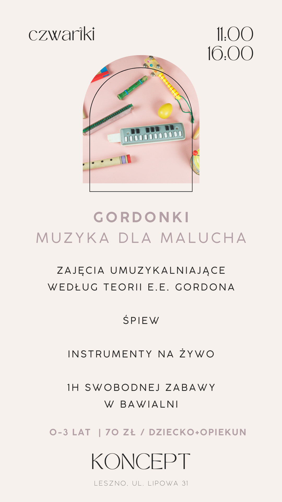 Opis wydarzenia: Zapraszamy na GORDONKI, czyli zajęcia umuzykalniające dla dzieci do 3. roku życia.
