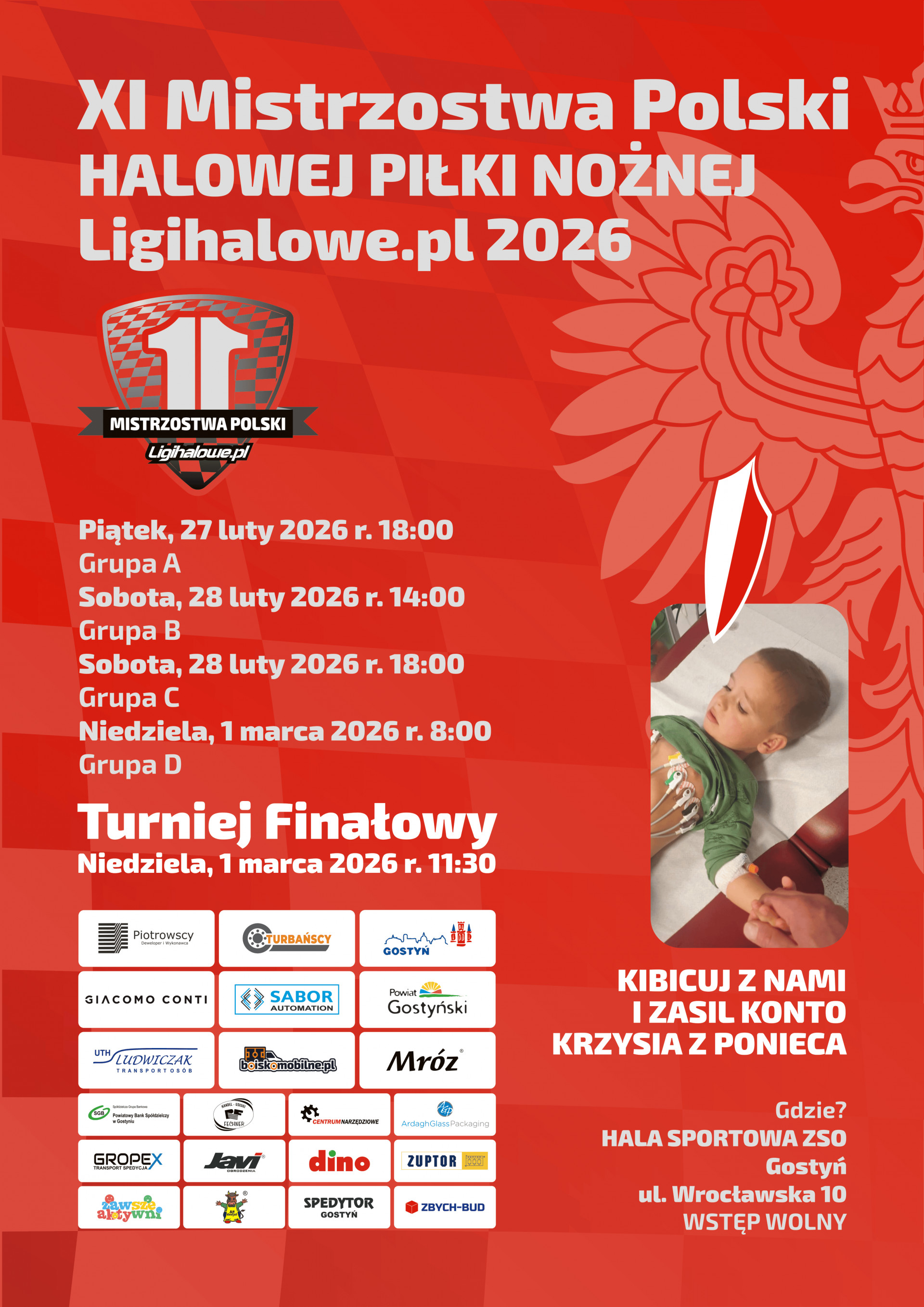 Opis wydarzenia: W dniach 27.02–01.03.2026 w Gostyniu odbędą się XI Mistrzostwa Polski Halowej Piłki Nożnej Ligihalowe.pl. Jak co roku do naszego miasta przyjadą jedne z najlepszych drużyn halowych w Polsce – m.in. z Gostynia, Krakowa, Wrocławia, Śremu, Bielszowic czy Sochaczewa. Przez kilka dni Gostyń znów stanie się stolicą halowej piłki nożnej.