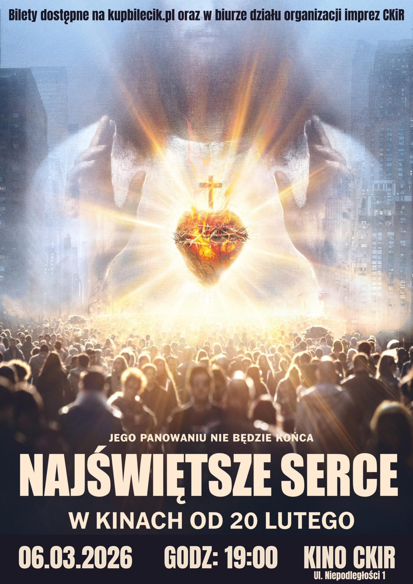 | Miejscowość: Wschowa Miejsce: Centrum Kultury i Rekreacji we Wschowie Data rozpoczęcia: 06.03.2026 19:00:00 Data zakończenia: 06.03.2026 21:00:00 Organizator: Centrum Kultury i Rekreacji we Wschowie Opis wydarzenia: „Najświętsze Serce” – opowieść o wierze i nadziei 6 marca 2026 r. (piątek) Godzina 19:00 Centrum Kultury i Rekreacji we Wschowie – sala widowiskowa Zwiastun filmu: https://m.youtube.com/watch?v=6el6be7t4t8 Bilety już w sprzedaży! Dostępne na stronie kupbilecik.pl oraz w Biurze Organizacji Imprez CKiR. https://www.kupbilecik.pl/imprezy/197071/Wschowa/Kino+CKiR+Wschowa+-+%22Najświętsze+Serce%22/ „Najświętsze Serce” to poruszający film inspirowany objawieniami, których ponad 350 lat temu we Francja doświadczyła św. Małgorzata Maria Alacoque. To opowieść o miłości Boga, która wciąż przemienia ludzkie życie i daje nadzieję w świecie pełnym samotności, zagubienia i braku sensu. Film łączy sceny fabularyzowane z autentycznymi świadectwami współczesnych ludzi, tworząc głęboką i refleksyjną historię – zarówno dla wierzących, jak i poszukujących. Serdecznie zapraszamy! |