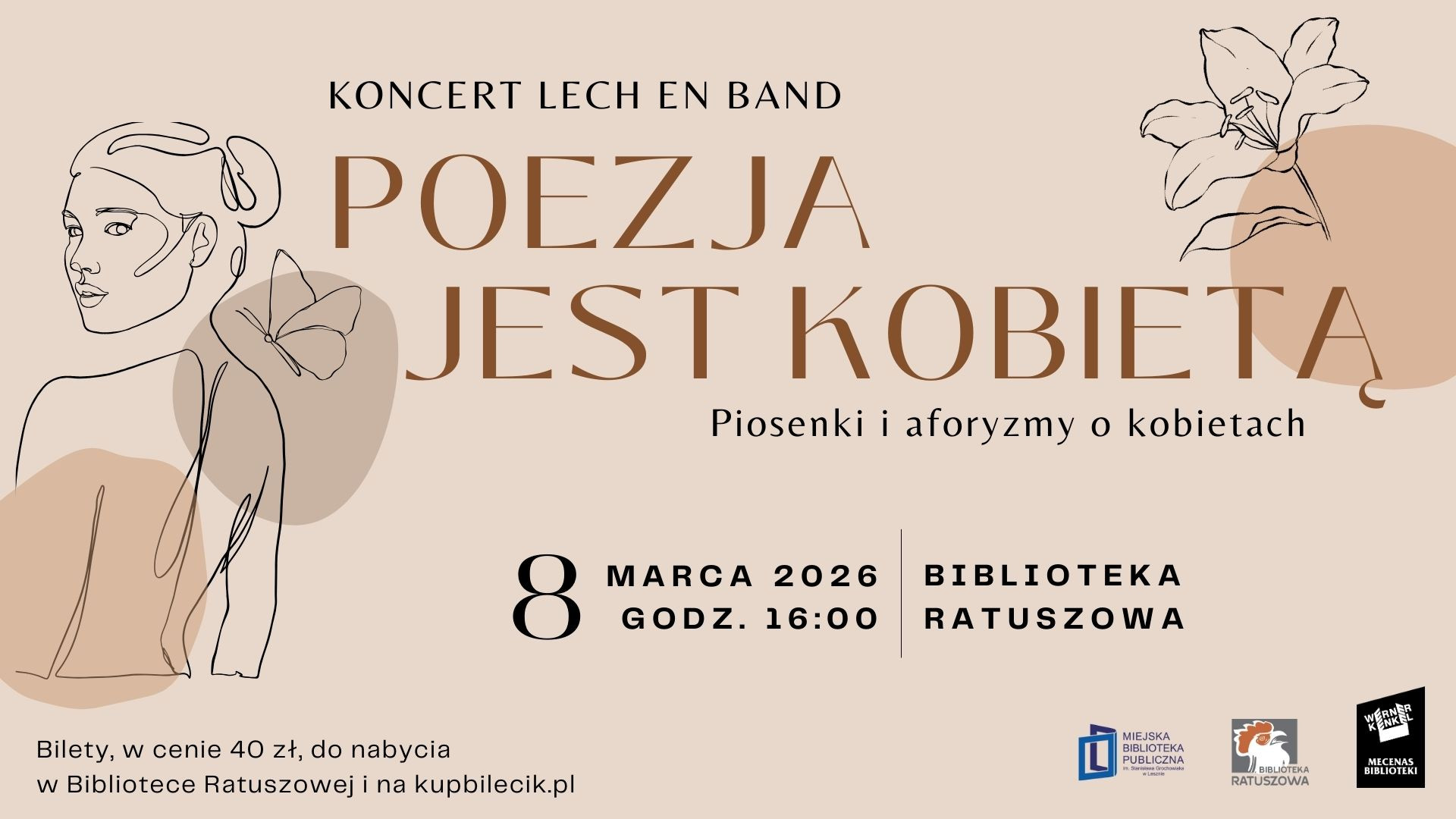 | Miejscowość: Leszno Miejsce: Biblioteka Ratuszowa Data rozpoczęcia: 08.03.2026 16:00:00 Data zakończenia: 08.03.2026 17:00:00 Organizator: MBP Leszno Opis wydarzenia: Na Dzień Kobiet można postawić na schemat. My proponujemy coś, co ma rytm, sens i dobrze dobrane słowa. „Poezja jest kobietą” to koncert o kobietach - tych z wierszy, z codzienności, z pamięci i z wyobraźni. Bez nadmiaru ozdobników, za to z uważnością na emocje. 8 marca 2026 o godz. 16:00 w Bibliotece Ratuszowej wystąpi Lech eN Band. W programie autorskie piosenki i aforyzmy Lecha Nawrockiego utrzymane w stylistyce lat 80. - melodyjne, literackie, z nutą nostalgii i subtelnego humoru. Zespół powstał sześć lat temu w Śremie i ma na koncie występy podczas konferencji poetyckich Związku Literatów Polskich, w bibliotekach, salach uniwersyteckich i pałacowych wnętrzach regionu. To muzyka, która nie udaje tła. Ona chce być słuchana. Skład zespołu: Iwona Jurga - śpiew Witalis Sąsiadek - gitara Lech Nawrocki - instrumenty klawiszowe Jarosław Synowiec - gitara basowa Tomasz Buchwald - perkusja Bilety w cenie 40 zł dostępne są w Bibliotece Ratuszowej oraz na kupbilecik.pl. 8 marca zapraszamy na popołudnie, w którym poezja naprawdę spotyka się z muzyką. |