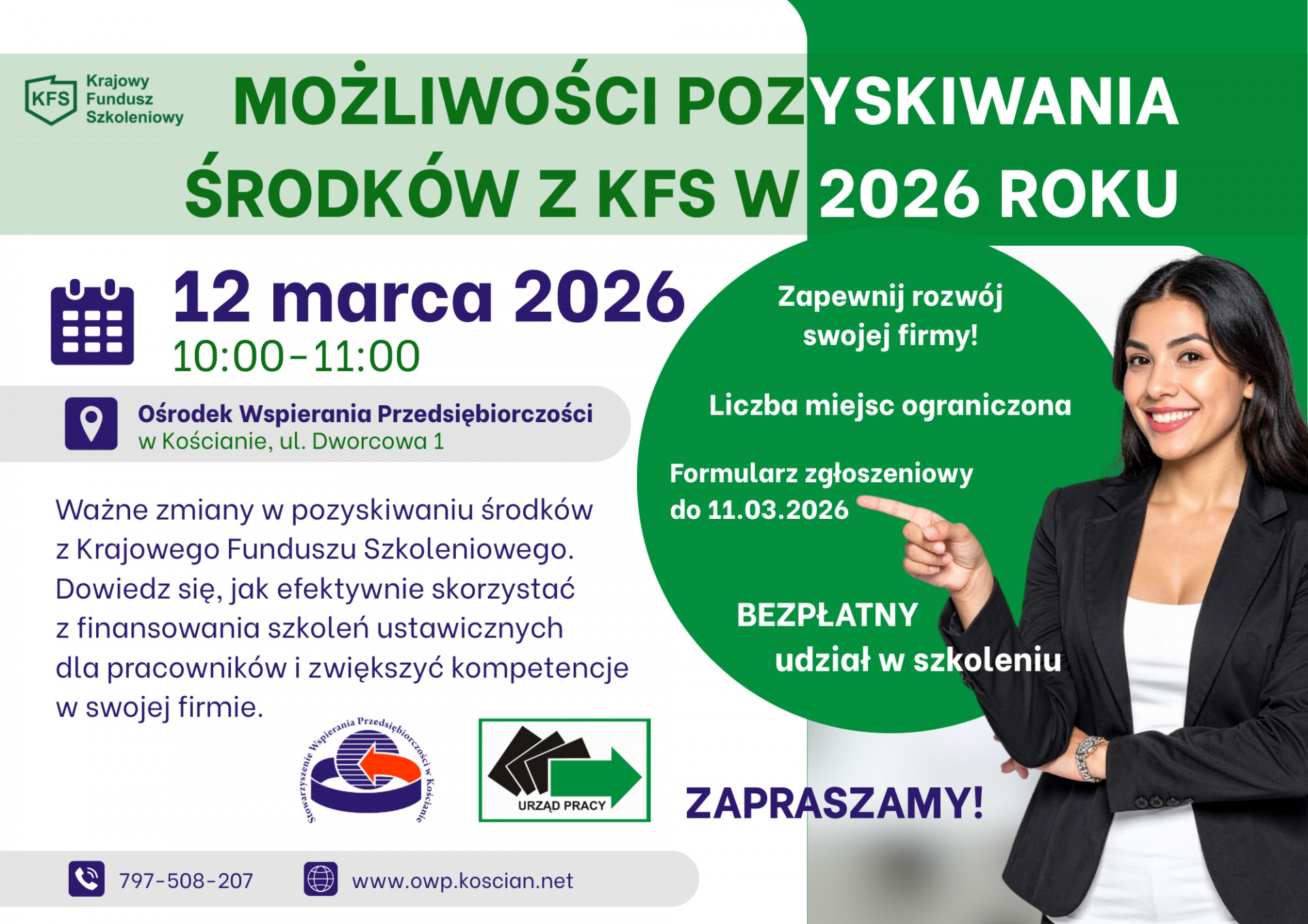 | Miejscowość: Kościan Miejsce: Ośrodek Wspierania Przedsiębiorczości w Kościanie, ul. Dworcowa 1 Data rozpoczęcia: 12.03.2026 10:00:00 Data zakończenia: 12.03.2026 11:00:00 Organizator: Stowarzyszenie Wspierania Przedsiębiorczości w Kościanie Opis wydarzenia: Stowarzyszenie Wspierania Przedsiębiorczości w Kościanie wraz z Powiatowym Urzędem Pracy w Kościanie zapraszają na bezpłatne szkolenie, podczas którego omówione zostaną najważniejsze zmiany w przepisach oraz praktyczne wskazówki dotyczące składania wniosków i korzystania ze środków KFS. W programie szkolenia: 1. Otwarcie spotkania i wprowadzenie do tematu, 2. Omówienie zmian w pozyskiwaniu środków z KFS w związku z wejściem w życie ustawy o rynku pracy i służbach zatrudnienia, 3. Prezentacja formularza wniosku o przyznanie środków w postaci elektronicznej, 4. Sesja pytań i odpowiedzi. Prowadzący: Danuta Nowak, Kierownik Centrum Aktywizacji Zawodowej oraz Mirosław Wilk, Starszy informatyk z Powiatowego Urzędu Pracy w Kościanie. Ważne! Osoby zainteresowane udziałem prosimy o wypełnienie formularza zgłoszeniowego do 11.03.2026 r. Udział w spotkaniu jest bezpłatny. Liczba miejsc ograniczona, decyduje kolejność zgłoszeń! Zapisz się na szkolenie i dowiedz się, jak efektywnie pozyskać środki na rozwój swoich pracowników! Więcej informacji pod nr tel. 797 508 207 oraz na stronie www.owp.koscian.net. ZAPRASZAMY! |