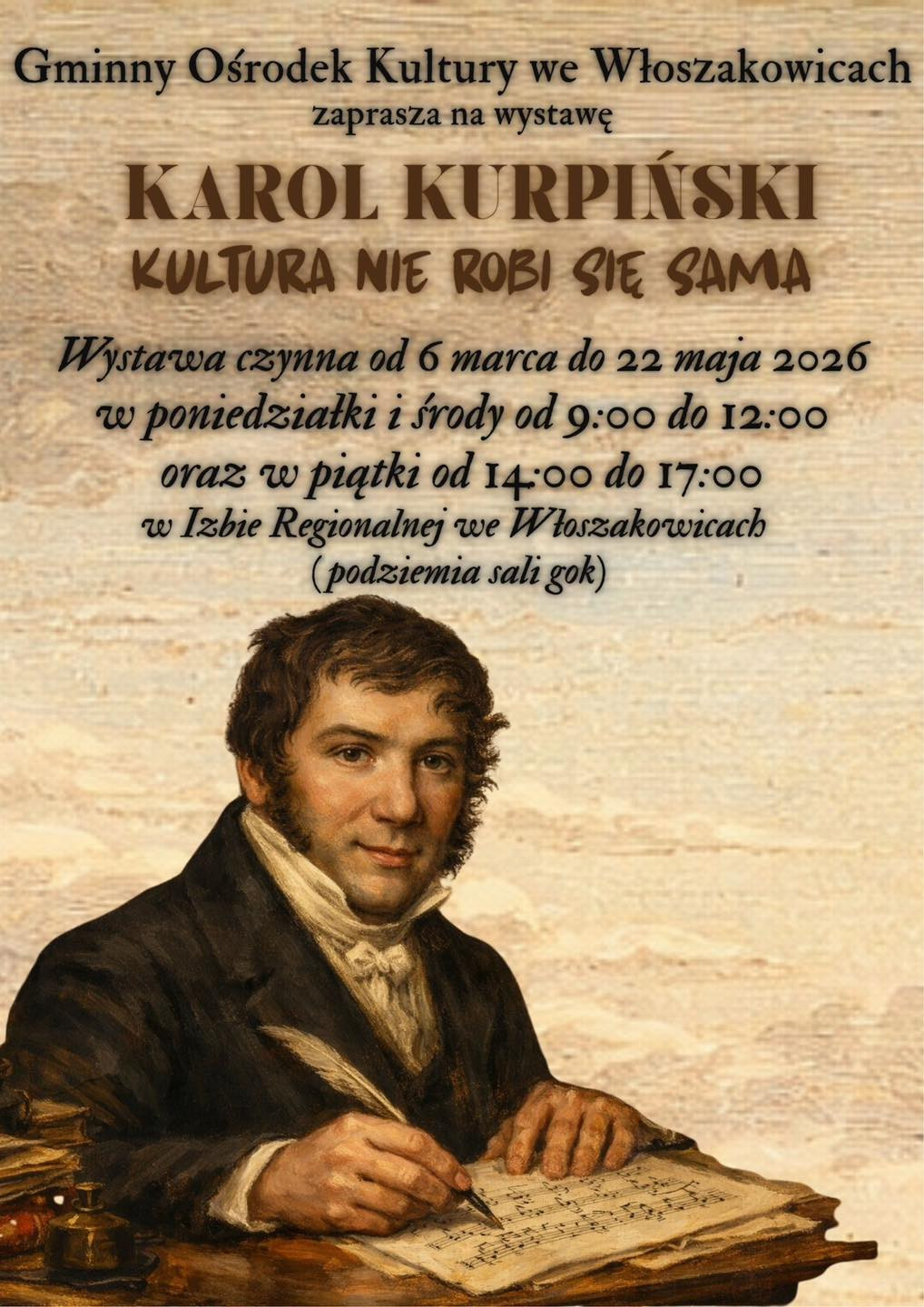 | Miejscowość: Włoszakowice Miejsce: Izba Regionalna im. Karola Kurpińskiego we Włoszakowicach Data rozpoczęcia: 06.03.2026 14:00:00 Data zakończenia: 22.05.2026 17:00:00 Organizator: Gminny Ośrodek Kultury we Włoszakowicach Opis wydarzenia: Gminny Ośrodek Kultury we Włoszakowicach serdecznie zaprasza na kolejną, wyjątkową wystawę poświęconą postaci Karola Kurpińskiego. Otwieramy ją w dniu urodzin kompozytora w piątek, 6 marca o godz. 14:00. Izba Regionalna GOK oferuje opowieść o tym, co Kurpiński robił w Warszawie, jak wyglądało jego życie oraz jak ogromny wpływ miał na rozwój polskiej kultury muzycznej. Wszystko to w wyjątkowej przestrzeni inspirowanej jego prywatnym pokojem – miejscu, które pozwoli jeszcze lepiej poczuć klimat epoki i codzienność kompozytora. Zapraszamy wszystkich do zagłębienia się w tę historię i zadania sobie pytania: Czy muzyczna kultura, którą znamy dziś, wyglądałaby tak samo, gdyby nie nasz Karol? Do zobaczenia na wystawie! Zwiedzać ją można w poniedziałki i środy od godz. 9:00 do 12:00, a w piątki od 14:00 – 17:00. |