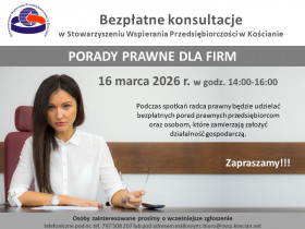 | Miejscowość: Kościan Miejsce: Ośrodek Wspierania Przedsiębiorczości w Kościanie, ul. Dworcowa 1 Data rozpoczęcia: 16.03.2026 14:00:00 Data zakończenia: 16.03.2026 16:00:00 Organizator: Stowarzyszenie Wspierania Przedsiębiorczości w Kościanie Opis wydarzenia: Jeśli chcesz dowiedzieć się więcej na temat pomocy dla firm, dręczą Cię wątpliwości natury prawnej, trafiłeś na problem, z którym nie potrafisz sobie poradzić, chcesz dowiedzieć się więcej na temat najnowszych uregulowań, szukasz rzetelnych informacji na temat sukcesji, przekształceń, odzyskiwania zaległych należności, lub innych spraw związanych z prowadzeniem działalności gospodarczej, zadzwoń i umów się na spotkanie. |