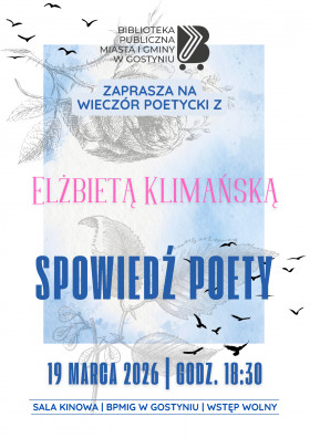 | Miejscowość: Gostyń Miejsce: Biblioteka w Gostyniu Data rozpoczęcia: 19.03.2026 18:30:00 Data zakończenia: 19.03.2026 20:00:00 Organizator: Biblioteka Publiczna Miasta i Gminy w Gostyniu Opis wydarzenia: 19 marca 2026 r. o godzinie 18:30 w Bibliotece Publicznej Miasta i Gminy w Gostyniu odbędzie się wyjątkowe spotkanie dla miłośników poezji. W ramach wieczorku poetyckiego pn „Spowiedź poety” owoce swojego talentu przedstawi Elżbieta Klimańska. Ta skromna, regionalna poetka, może pochwalić się dorobkiem liczącym ponad 200 wierszy. Mimo iż jej twórczość nie została do tej pory oficjalnie opublikowana, czytelnicy z nią obcujący zauważają, że wiersze te wzbudzają w nich zachwyt czy wzruszenie oraz wskazują, że ich klimat przypomina im dzieła znanych, polskich poetek. W czasie spotkania uczestnicy będą mogli nie tylko wysłuchać wybranych utworów artystki, lecz również zabrać ze sobą pamiątkowy folder, zawierający namiastkę poezji będącą przedmiotem spotkania. Serdecznie zapraszamy do udziału w tym niepowszednim wydarzeniu, podczas którego będzie okazja, aby wysłuchać osoby nietuzinkowej – człowieka, być może mijanego obojętnie każdego dnia, a który chce opowiedzieć światu o rzeczach ważnych i pięknych. |