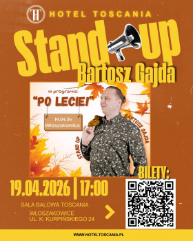 | Miejscowość: WŁOSZAKOWICE Miejsce: HOTEL TOSCANIA Data rozpoczęcia: 19.04.2026 17:00:00 Data zakończenia: 19.04.2026 20:00:00 Organizator: HOTEL TOSCANIA Opis wydarzenia: - ! Już 19 kwietnia o godz. 17:00 na scenie w Sali Balowej Toscania wystąpi Bartosz Gajda. Od 20 lat na scenie - w kabarecie, telewizji, radiu, stand-upie. Najnowszy program „PO LECIE!” Bilety: https://www.kupbilecik.pl/.../Stand-up%3A+Bartosz+Gajda/ Liczba miejsc ograniczona - dawka śmiechu gwarantowana! |