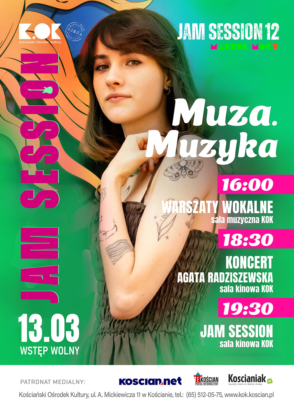 | Miejscowość: Kościan Miejsce: KOK, ul. Mickiewicza 11 Data rozpoczęcia: 13.03.2026 18:30:00 Data zakończenia: 13.03.2026 21:00:00 Organizator: Kościański Ośrodek Kultury Opis wydarzenia: Marzec w Kościańskim Ośrodku Kultury upłynie pod znakiem wyjątkowej energii. MARZEC MOCY to zaproszenie do świętowania kobiecości w jej różnorodnych odsłonach – poprzez kulturę, sztukę i spotkanie. W programie całego miesiąca znalazły się koncerty, kino, teatr, warsztaty artystyczne i rozwojowe oraz inspirujące rozmowy. To przestrzeń tworzona z myślą o kobietach i przez kobiety, ale otwarta dla wszystkich. Jednym z ważnych wydarzeń tegorocznej edycji będzie 12. Jam Session pt. „Muza. Muzyka.”, które odbędzie się 13 marca (piątek). Sam tytuł nie jest przypadkowy. Muza – symbol kobiety natchnienia. Muzyka – żywa, emocjonalna, intuicyjna. W tym połączeniu kryje się opowieść o kobiecie jako inspiracji, ale też jako twórczyni, której głos wybrzmiewa odważnie i świadomie. Wydarzenie rozpocznie się o godzinie 16:00 w sali muzycznej warsztatami wokalnymi prowadzonymi przez Agatę Radziszewską – wokalistkę i trenera wokalnego. Podczas spotkania uczestnicy popracują nad emisją głosu, interpretacją i sceniczną swobodą. Wspólnie przygotują utwór lub jego fragment, który jeszcze tego samego wieczoru zabrzmi podczas koncertu. O godzinie 18:30 w sali kinowej odbędzie się koncert Agaty Radziszewskiej. Będzie to muzyczne spotkanie pełne emocji i autentycznej ekspresji, zwieńczone wspólnym wykonaniem przygotowanego wcześniej utworu wraz z uczestnikami warsztatów, a o 19:30, również w sali kinowej, rozpocznie się Jam Session. Będzie to otwarta przestrzeń do improwizacji, wspólnego grania i swobodnej ekspresji dźwiękiem. To moment, w którym scena staje się miejscem dialogu, a muzyka – wspólnym doświadczeniem. Wstęp na wszystkie części wydarzenia jest wolny. Data: Piątek 13 marca 2026 godz. 16:00, warsztaty wokalne (sala muzyczna), godz. 18:30 koncert (sala kinowa), godz. 19:30 Jam Session (sala kinowa). Zapraszamy do współtworzenia i do bycia częścią Marca Mocy. Do zobaczenia w KOK-u! |