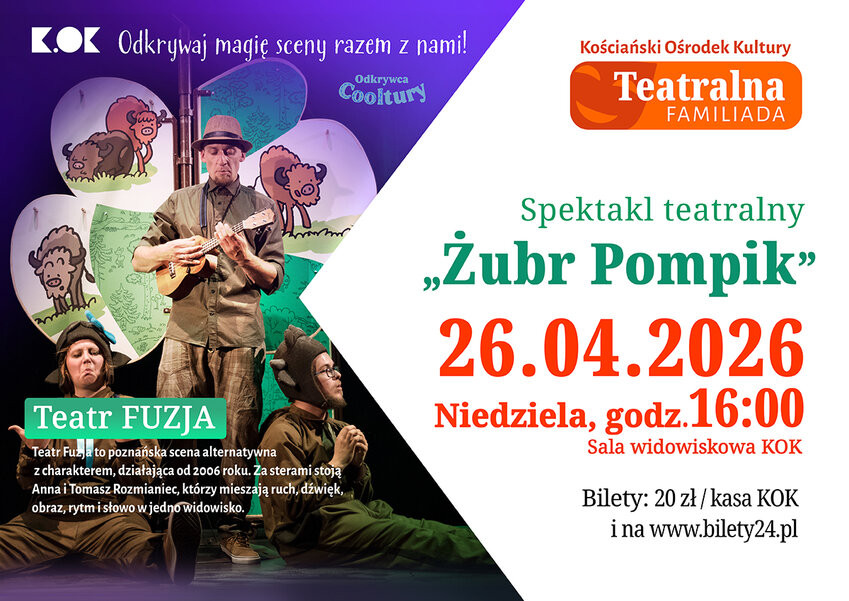 | Miejscowość: Kościan Miejsce: Kościański Ośrodek Kultury Data rozpoczęcia: 26.04.2026 16:00:00 Data zakończenia: 26.04.2026 17:00:00 Organizator: Kościański Ośrodek Kultury Opis wydarzenia: Teatralna Familiada w wiosennej odsłonie Już w niedzielę, 26 kwietnia, zapraszamy do Kościańskiego Ośrodka Kultury na kolejne wyjątkowe spotkanie z teatrem dla młodego widza. Cykl Teatralna Familiada, który kościaniacy pokochali, znów wypełni salę śmiechem, emocjami i dziecięcą ciekawością świata. Nic dziwnego, że bilety na te wydarzenia znikają w mgnieniu oka – to prawdziwe święto teatru dla całej rodziny. Tym razem na scenie pojawi się niezwykły bohater – „Żubr Pompik” w wykonaniu Teatru Fuzja. To ciepła, pełna humoru i muzyki opowieść o małym żubrze odkrywcy, który razem ze swoją energiczną siostrą Polinką wyrusza w głąb puszczy, by poznawać jej zapachy, dźwięki i mieszkańców. Pompik widzi więcej niż inni – z dziecięcą ciekawością odkrywa świat przyrody, zadaje pytania, popełnia zabawne pomyłki i uczy się tego, co w życiu naprawdę ważne: przyjaźni, uważności i szacunku do natury. Spektakl wciąga widzów w magiczny świat lasu, w którym dźwięki przyrody powstają na żywo, a scena zamienia się w pełną przygód leśną krainę. To przedstawienie, które zachwyci najmłodszych, ale równie mocno poruszy dorosłych – bo każdy z nas, choć na chwilę, może znów spojrzeć na świat oczami dziecka. Teatr odgrywa niezwykle ważną rolę w rozwoju najmłodszych – rozwija wyobraźnię, wrażliwość i uczy emocji poprzez historię, obraz i dźwięk. A wspólne wyjście do teatru to coś więcej niż wydarzenie kulturalne – to czas, który buduje rodzinne wspomnienia i przypomina nam, że najcenniejsze chwile to te spędzone razem. Zapraszamy całe rodziny na niezwykłą teatralną przygodę! Pozwólmy dzieciom odkrywać świat poprzez sztukę, a sobie – na chwilę powrotu do dziecięcej ciekawości. Teatr Fuzja "ŻUBR POMPIK" na motywach serii książki Tomasza Samojlika Inscenizacja: Anna Rozmianiec Reżyseria: Tomasz Rozmianiec Muzyka: Jakub Woźniak Obsada: Agnieszka Mikulska, Karol Loręcki, Tomasz Rozmianiec, Jakub Woźniak Kiedy: 26 kwietnia (Niedziela) 2026 r. Godzina: 16:00 Gdzie: Sala widowiskowa KOK Czas trwania: Spektakl trwa 50 minut i jest propozycją dla całych rodzin – od przedszkolaków po dorosłych widzów. Wiek dziecka: 4-105 lat Bilety: 20 zł/os. w kasie KOK (w godzinach pracy sekretariatu pon.-pt., od 8:00 do 15:00 i na godzinę przed spektaklem) oraz na bilety24.pl |