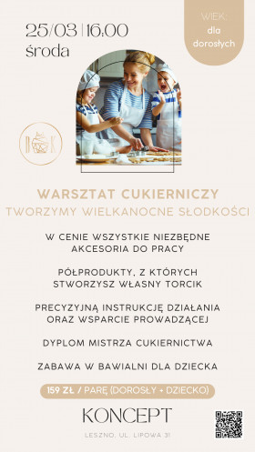 Pod okiem Basi z Pracowni Wielu Smaków rodzice wraz z dziećmi stworzą i udekorują kruchy torcik, a że Wielkanoc zbliża się wielkimi krokami będzie on miał kształt wielkanocnego jajka.