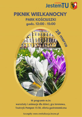 | Miejscowość: Leszno Miejsce: Park przy Placu T. Kościuszki Data rozpoczęcia: 28.03.2026 12:00:00 Data zakończenia: 28.03.2026 15:00:00 Organizator: Miasto Leszno Opis wydarzenia: Miasto Leszno zaprasza na Piknik Wielkanocny, który odbędzie się 28 marca w godzinach 12:00–15:00 w Parku Kościuszki. To doskonała okazja, aby spędzić czas w gronie rodziny i przyjaciół, ciesząc się wiosenną atmosferą oraz licznymi wielkanocnymi atrakcjami. Na uczestników pikniku czekają m.in. dmuchańce, dmuchana kula z kulkami, wielkanocny tor przeszkód, wyścigi jajek oraz zawody w skokach w workach, które poprowadzi Krzysztof Tumko. Będzie to świetna okazja, aby sprawdzić swoje umiejętności i spróbować sił w radosnej rywalizacji na świeżym powietrzu. Ponadto będzie czekać strefa warsztatowa w klimacie wielkanocnym, w której będzie można przygotować tradycyjne palmy oraz własnoręczne ozdoby świąteczne. W ramach zajęć „Malowane Święta” powstaną kolorowe dekoracje inspirowane wielkanocnymi tradycjami. Fundacja Centrum Aktywności Twórczej przygotuje również animacje i zabawy dla dzieci oraz całych rodzin. Wśród atrakcji dla najmłodszych znajdzie się również gra terenowa „Pogoń za zającem” (12:00–15:00), przygotowana przez Leszczyński Bank Żywności. O godzinie 13:30 odbędzie się także wielkanocne przedstawienie „Zając w Paski” w wykonaniu Teatrzyku Pompon. Dodatkowo w godzinach 12:00–14:00 Młodzieżowe Centrum Profilaktyki Alternatywa w Lesznie zaprezentuje swoje umiejętności kuglarskie i animacyjne. W strefie warsztatowej obecne będzie także Muzeum Okręgowe w Lesznie, które przybliży mieszkańcom wielkanocne tradycje. Podczas wydarzenia nie zabraknie również stoisk gastronomicznych przygotowanych przez lokalnych przedsiębiorców. Serdecznie zapraszamy do wspólnego spędzenia przedświątecznego czasu w Parku Kościuszki! |