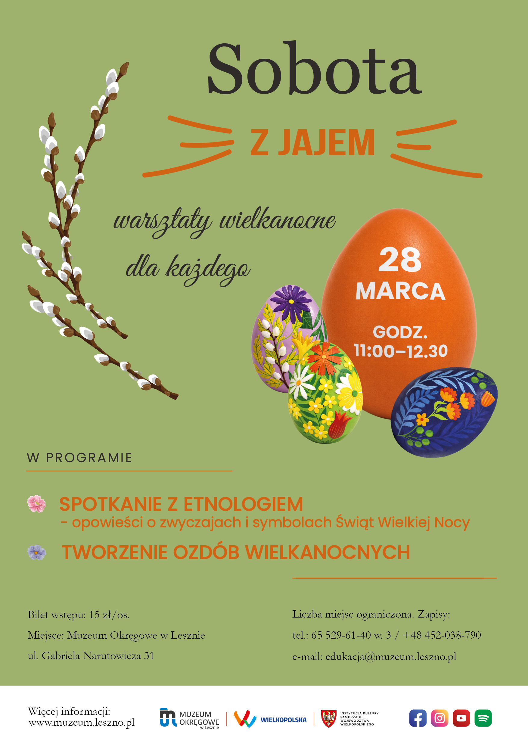 | Miejscowość: Leszno Miejsce: Muzuem Okręgowe w Lesznie, ul. G. Narutowicza 31 Data rozpoczęcia: 28.03.2026 11:00:00 Data zakończenia: 28.03.2026 12:30:00 Organizator: Muzuem Okręgowe w Lesznie Opis wydarzenia: Wraz ze zbliżającymi się Świętami Wielkiej Nocy zapraszamy do wspólnego odkrywania ich wyjątkowej atmosfery – pełnej kolorów i tradycji. To czas, który warto zatrzymać na chwilę i wypełnić twórczym działaniem oraz inspirującymi spotkaniami. Zapraszamy na wyjątkowe, międzypokoleniowe warsztaty wielkanocne, które wprowadzą Was w świąteczny nastrój poprzez twórcze działanie i spotkanie z tradycją. Spotkanie odbędzie się 28 marca 2026, w sobotę sobota, o godz. 11:00, w Muzeum Okręgowym w Lesznie. W programie: spotkanie z etnologiem Tomaszem Rakiem, który opowie o zwyczajach i symbolice Wielkanocy w południowo-zachodniej Wielkopolsce warsztaty plastyczne, podczas których wykonacie własne pisanki, koszyczki i wielkanocne zajączki To doskonała okazja, by wspólnie – z rodziną lub przyjaciółmi – stworzyć niepowtarzalne dekoracje, poznać regionalne tradycje i spędzić czas w twórczej atmosferze Muzeum. Zapewniamy wszystkie materiały oraz wsparcie prowadzących. Zapraszamy dzieci, młodzież, dorosłych i seniorów – każdego, kto chce poczuć magię nadchodzących świąt. |