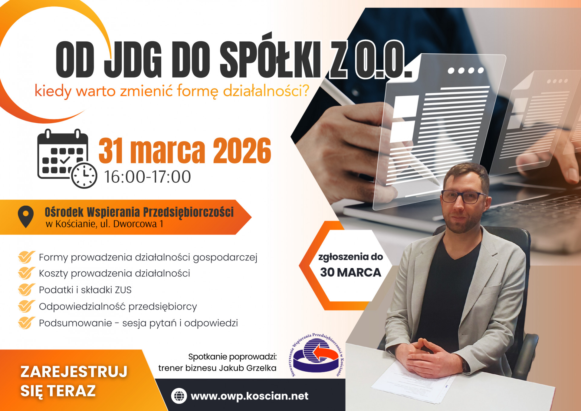 | Miejscowość: Kościan Miejsce: Ośrodek Wspierania Przedsiębiorczości w Kościanie, ul. Dworcowa 1 Data rozpoczęcia: 31.03.2026 16:00:00 Data zakończenia: 31.03.2026 17:00:00 Organizator: Stowarzyszenie Wspierania Przedsiębiorczości w Kościanie Opis wydarzenia: Stowarzyszenie Wspierania Przedsiębiorczości w Kościanie zaprasza wszystkich zainteresowanych na bezpłatne szkolenie. Podczas spotkania omówione zostaną najważniejsze aspekty związane z wyborem formy prowadzenia działalności gospodarczej oraz sytuacje, w których przekształcenie jednoosobowej działalności gospodarczej w spółkę z o.o. może być korzystne dla przedsiębiorcy. W programie szkolenia: 1.Formy prowadzenia działalności gospodarczej 2.Koszty prowadzenia działalności 3.Podatki i składki ZUS 4.Odpowiedzialność przedsiębiorcy 5.Podsumowanie – sesja pytań i odpowiedzi Spotkanie poprowadzi Jakub Grzelka - trener biznesu, właściciel firmy Storage Business Services w Kościanie, promotor tworzenia startup’ów oraz zakładania działalności gospodarczej. Ważne! Osoby zainteresowane udziałem prosimy o wypełnienie formularza zgłoszeniowego do 30.03.2026 r. Liczba miejsc ograniczona, decyduje kolejność zgłoszeń!!! ZAPRASZAMY! |