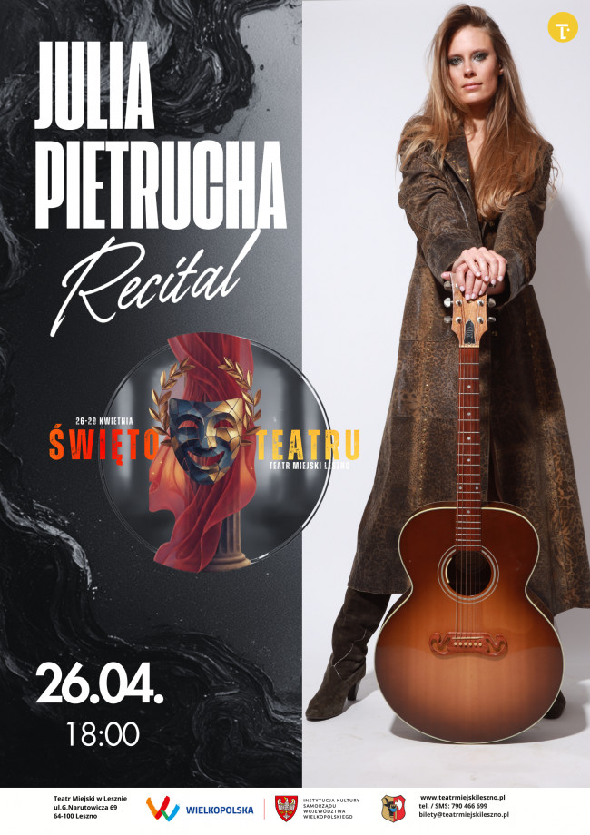 | Miejscowość: Leszno Miejsce: Teatr Miejski w Lesznie, ul. Narutowicza 69 Data rozpoczęcia: 26.04.2026 18:00:00 Data zakończenia: 26.04.2026 18:00:00 Organizator: Teatr Miejski w Lesznie Opis wydarzenia: Teatr Miejski w Lesznie zaprasza na pierwszą odsłonę tegorocznego Święta Teatru – Recital Julii Pietruchy. Julia Pietrucha zaprasza na wyjątkowy recital, będący muzyczną podróżą przez jej solową twórczość. Artystka zabiera publiczność w kojący świat słonecznych, folkowo-popowych melodii, które stały się ścieżką dźwiękową jej artystycznych i życiowych podróży. Program koncertu obejmuje utwory z jej dotychczasowych albumów – od ciepłych brzmień debiutanckiej płyty Parsley, przez folkowe inspiracje projektu Folk it tour, aż po dojrzałą, eteryczną przestrzeń najnowszego albumu Neonova. Na scenie Julii Pietrusze towarzyszyć będą muzycy, z którymi współpracuje od wielu lat – Maciej Starnawski oraz Maciej Papalski. Recital będzie okazją do spotkania z muzyką pełną subtelności, nostalgii i pięknych brzmień. Obsada Julia Pietrucha, Maciej Starnawski, Maciej Papalski Zapraszamy do zakupu biletów w kasie teatru – tel. 790 466 699 lub online https://www.teatrmiejskileszno.pl/SWIETO_TEATRU_JULIA_PIETRUCHA_RECITAL,12,207 |