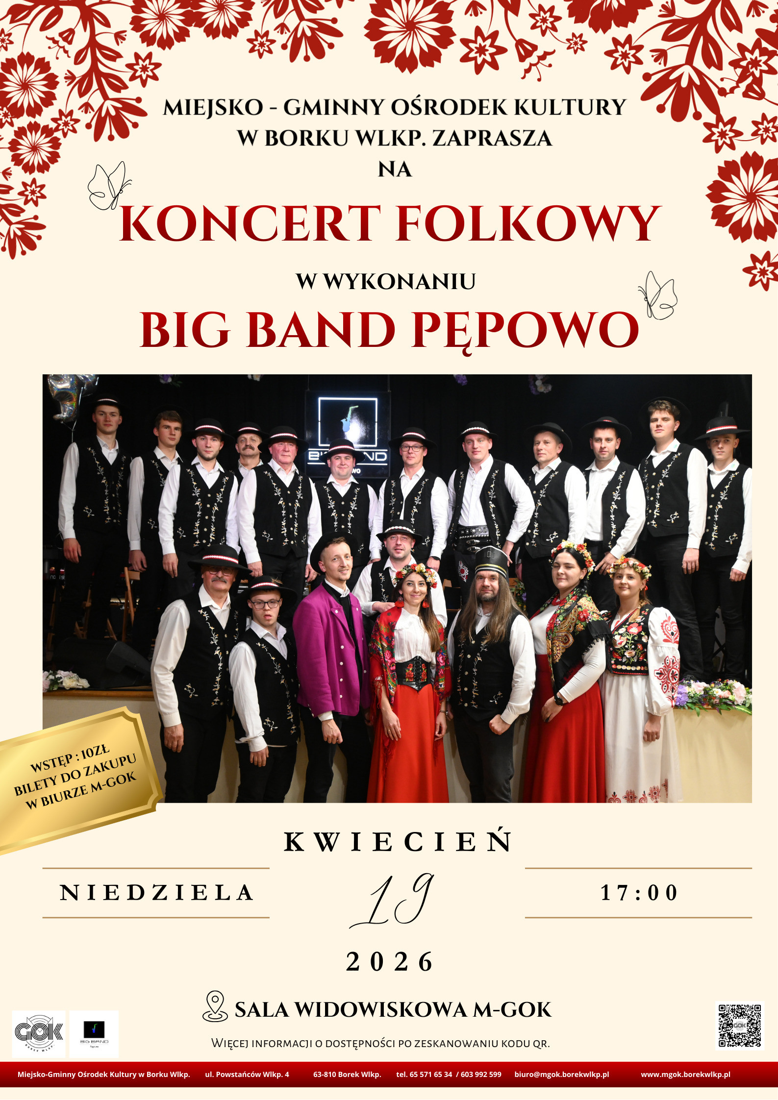| Miejscowość: Borek Wlkp. Miejsce: M-GOK Borek Wlkp. Data rozpoczęcia: 19.04.2026 17:00:00 Data zakończenia: 19.04.2026 19:00:00 Organizator: M-GOK Borek Wlkp. Opis wydarzenia: Masz plany na 19.04.? Już masz! Zapraszamy na FOLKOWY KONCERT, który rozgrzeje atmosferę i porwie do rytmu. Folkowe nuty + energia Big Band Pępowo = gwarancja świetnego popołudnia! Bilety do nabycia w biurze M-GOK |