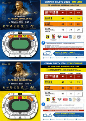 | Miejscowość: Leszno Miejsce: Stadion im. Alfreda Smoczyka Data rozpoczęcia: 29.03.2026 13:45:00 Data zakończenia: 29.03.2026 16:00:00 Organizator: KS Unia Leszno Opis wydarzenia: 29 marca (niedziela) o godzinie 13:45 rozpocznie się 76. Memoriał Alfreda Smoczyka. Poniżej prezentujemy listę startową oraz ceny biletów na to wydarzenie. Przypominamy, że KARNETY NIE OBOWIĄZUJĄ NA MEMORIAŁ ALFREDA SMOCZYKA! |