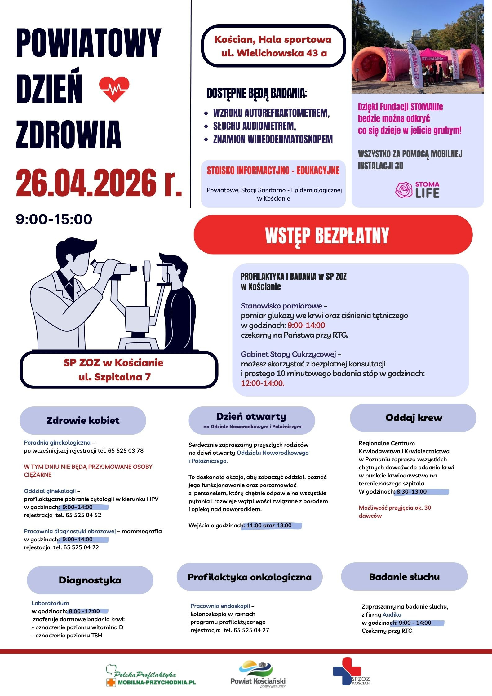 | Miejscowość: Kościan Miejsce: Hala sportowa ul. Wielichowska 43 a, SP ZOZ w Kościanie Data rozpoczęcia: 26.04.2026 09:00:00 Data zakończenia: 26.04.2026 15:00:00 Organizator: Starosta Powiatowy, SP ZOZ w Kościanie Opis wydarzenia: Serdecznie zapraszamy do skorzystania z darmowych badań podczas Powiatowego Dnia Zdrowia, który odbędzie się 26 kwietnia 2026 roku. Badania zostaną przeprowadzone w dwóch lokalizacjach: hali sportowej przy ul. Wielichowska 43 a oraz w SP ZOZ w Kościanie. Zachęcamy każdego do zadbania o swoje zdrowie. |
