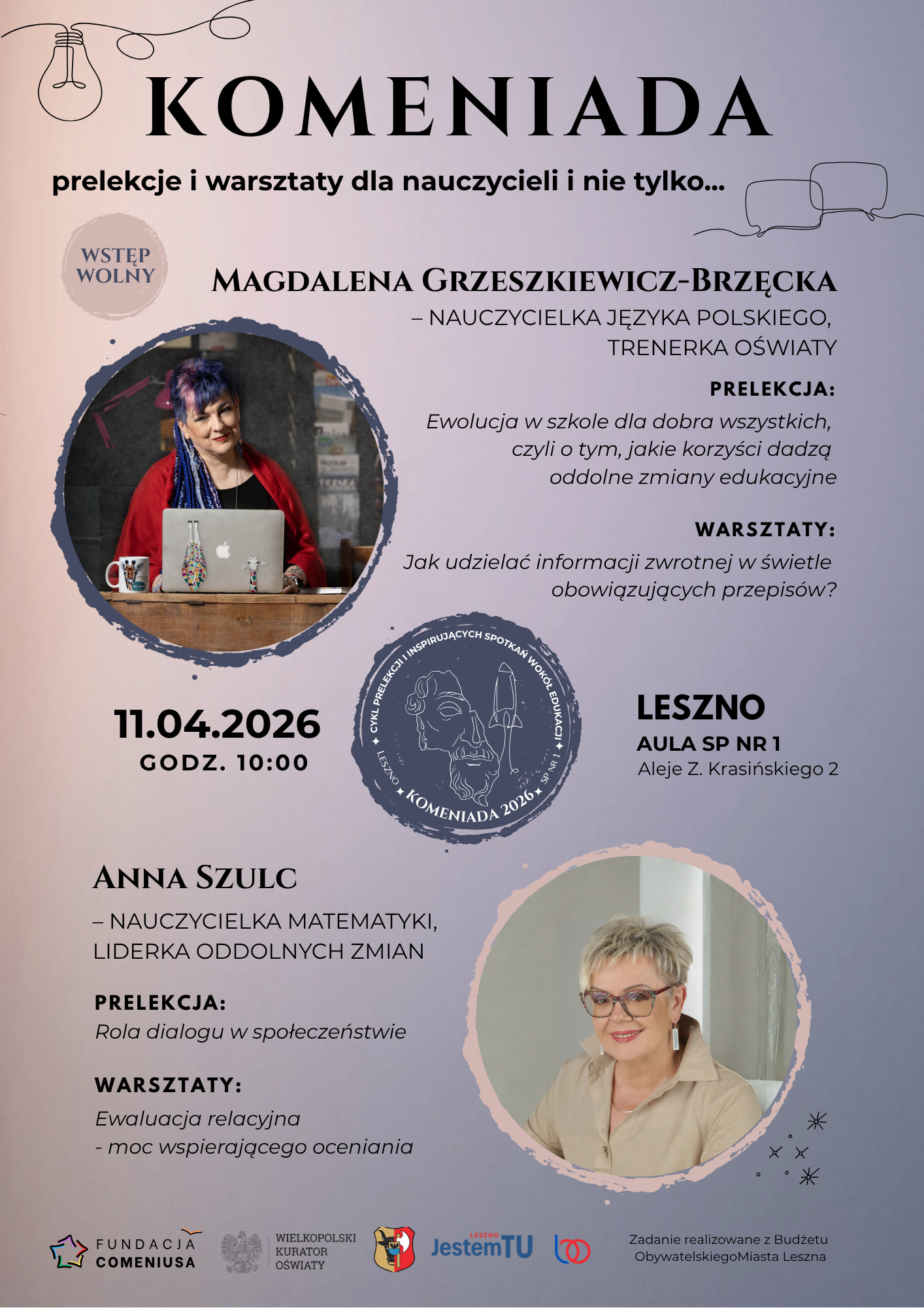 | Miejscowość: Leszno Miejsce: Aula SP nr 1 w Lesznie, Aleja Zygmunta Krasińskiego 2 Data rozpoczęcia: 11.04.2026 10:00:00 Data zakończenia: 11.04.2026 14:00:00 Organizator: Fundacja Comeniusa Opis wydarzenia: Zapraszamy na wyjątkowe wydarzenie pełne wiedzy, refleksji i praktycznych narzędzi dla nauczycieli (i nie tylko!) W programie: Magdalena Grzeszkiewicz-Brzęcka – nauczycielka języka polskiego, trenerka oświaty Prelekcja: „Ewolucja w szkole dla dobra wszystkich, czyli o tym, jakie korzyści dadzą oddolne zmiany edukacyjne” Warsztaty: „Jak udzielać informacji zwrotnej w świetle obowiązujących przepisów?” Anna Szulc – nauczycielka matematyki, liderka oddolnych zmian Prelekcja: „Rola dialogu w społeczeństwie” Warsztaty: „Ewaluacja relacyjna – moc wspierającego oceniania” Data: 11 kwietnia 2026 Godzina: 10:00 Miejsce: Aula SP nr 1 w Lesznie (Al. Z. Krasińskiego 2) Wstęp wolny! To doskonała okazja, by: poszerzyć swoje kompetencje wymienić doświadczenia zainspirować się do działania w edukacji Dołącz do nas i bądź częścią pozytywnych zmian w szkole! Wydarzenie objęte jest patronatem Wielkopolskiego Kuratora Oświaty i finansowane z Budżetu Obywatelskiego miasta Leszna |