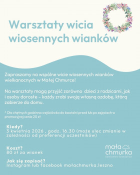 | Miejscowość: Leszno Miejsce: Mała Chmurka kawiarnio-bawialnia Data rozpoczęcia: 03.04.2026 16:30:00 Data zakończenia: 03.04.2026 17:30:00 Organizator: Mała Chmurka Opis wydarzenia: Zapraszamy na wspólne wicie wiosennych, wielkanocnych wianków w Małej Chmurce! Każdy uczestnik wykona własną, niepowtarzalną ozdobę, którą zabierze do domu jako świąteczną dekorację. |