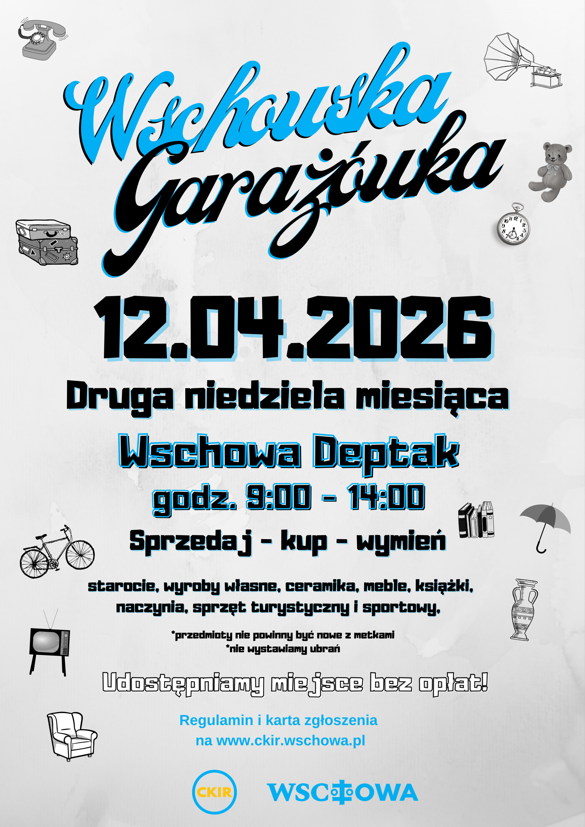 | Miejscowość: Wschowa Miejsce: Deptak Wschowa Data rozpoczęcia: 12.04.2026 09:00:00 Data zakończenia: 12.04.2026 14:00:00 Organizator: Centrum Kultury i Rekreacji we Wschowie Opis wydarzenia: Wracamy z Garażówką! Już 12.04.2026 zapraszamy na kolejną edycję Wschowskiej Garażówki! Spotykamy się w nowym miejscu - Wschowa Deptak w godz. 9:00–14:00. Masz rzeczy, którym chcesz dać drugie życie? A może polujesz na wyjątkowe perełki? Sprzedaj Kup Wymień Na miejscu znajdziesz m.in.: starocie, rękodzieło, ceramikę, meble, książki, naczynia oraz sprzęt turystyczny i sportowy. Udział jest całkowicie BEZPŁATNY – udostępniamy miejsce bez opłat! Zbieraj znajomych, przygotuj swoje skarby i widzimy się na deptaku! Szczegóły i zapisy: https://ckir.wschowa.pl/wschowska-garazowka/ |