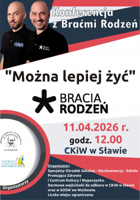 | Miejscowość: Sława Miejsce: Kino Żeglarz" Data rozpoczęcia: 11.04.2026 12:00:00 Data zakończenia: 11.04.2026 14:00:00 Organizator: SOSW - Szkoła Promująca Zdrowie i SCKiW Opis wydarzenia: Serdecznie zapraszamy na konferencję pod tytułem „Można lepiej żyć” z udziałem braci Rodzeń. |