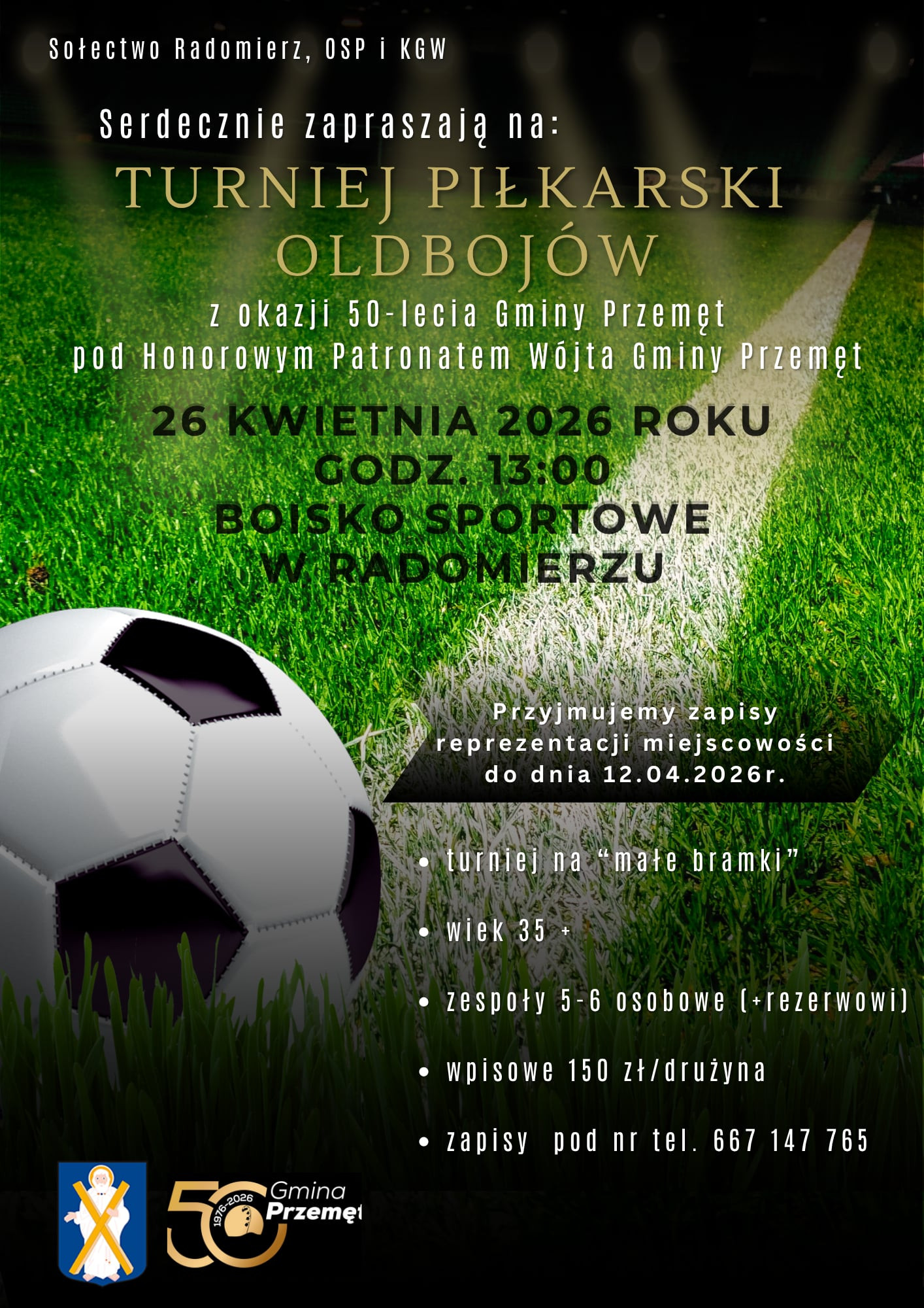 | Miejscowość: Radomierz Miejsce: Boisko sportowe Data rozpoczęcia: 26.04.2026 13:00:00 Data zakończenia: 26.04.2026 16:30:00 Organizator: Sołectwo Radomierz Opis wydarzenia: Gmina Przemęt świętuje swoje 50 lecie także przez sport gdzie zupełnie amatorskie drużyny wiejskie z terenu gminy zmierzą się w turnieju piłkarskim oldbojów. Zawodnicy w średnim i starszym wieku pokażą dzieciom i młodzieży jak aktywnie można spędzać czas nawet w tym wieku odciągając ich od ekranów telefonów czy złudnej aktywności na hulajnogach elektrycznych! |