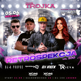 | Miejscowość: Leszno Miejsce: Club Trojka Os. Sułkowskiego 46 Data rozpoczęcia: 05.04.2026 21:00:00 Data zakończenia: 06.04.2026 03:00:00 Organizator: DJ INOX / TRICYA / DJ A PROPOS / RANDY K / PRO ARTI by Artur Chojnacki Opis wydarzenia: Większość odsłon RETROSPEKCJI powstawała w studiu jako podcast, jednak tylko wybrane edycje miały wyjątkową, klubową formę lub realizowane były poza studiem. Vol. 100 to jedna z tych nocy - wydarzenie specjalne, które nabiera pełnej mocy na parkiecie. Club Trojka to miejsce o klubowej historii i charakterze - idealnie wpisuje się w klimat jubileuszu i muzycznej retrospekcji. Czeka na Ciebie przekrój największych klubowych hitów minionych lat - utwory, które budowały parkiety, sety i podcastowe odsłony RETROSPEKCJI. Za konsoletą tej nocy: DJ INOX / TRICYA / DJ A PROPOS / RANDY K Jubileuszową oprawę wizualną i klimat wydarzenia zapewnia partner PRO ARTI by Artur Chojnacki. |