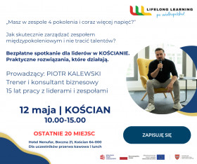| Miejscowość: Kościan Miejsce: Hotel Nenufar, Boczna 21, Koscian 64-000 Data rozpoczęcia: 12.05.2026 10:00:00 Data zakończenia: 12.05.2026 15:00:00 Organizator: Wojewódzki Urząd Pracy w Poznaniu Opis wydarzenia: Szanowny Panie/ Szanowna Pani, Wojewódzki Urząd Pracy w Poznaniu wraz z partnerem Tarraya SA ma przyjemność zaprosić Państwa na spotkania edukacyjno-informacyjne pt. „Rola pracodawcy w procesie uczenia się pracownika” KOŚCIAN 12.05.2026 r., godz. 10:00–15:00 MIEJSCE: Hotel Nenufar | Boczna 21, Kościan 64-000 TEMAT SPOTKANIA: Zarządzanie talentami w zespołach międzypokoleniowych Prowadzący: Piotr Kalewski Celem spotkania jest przedstawienie praktycznych metod zarządzania talentami w zespołach międzypokoleniowych. Uczestnicy poznają sposoby identyfikowania potencjału pracowników, efektywnego wykorzystywania różnorodności pokoleniowej oraz budowania środowiska pracy sprzyjającego rozwojowi, współpracy i utrzymaniu kluczowych talentów w organizacji. LINK DO ZAPISÓW: https://rolapracodawcy-subregionkaliski.konfeo.com Szczegółowych informacji udziela: Paulina Bekas | e-mail: paulina.bekas@gmail.com tel. 695 853 503 |