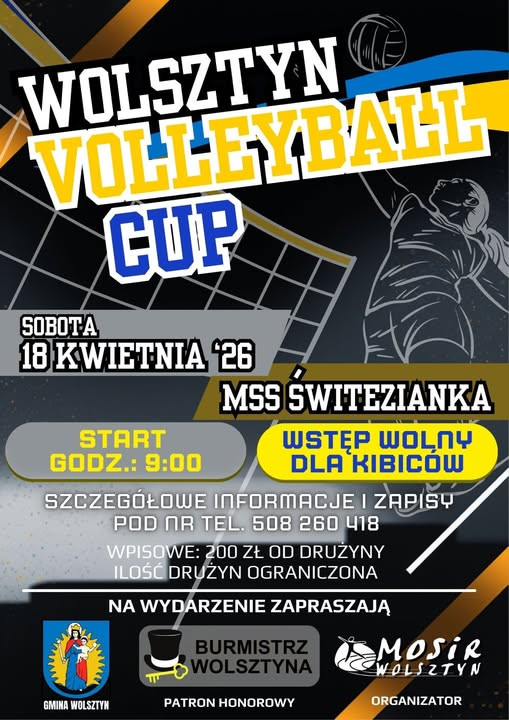 | Miejscowość: Wolsztyn Miejsce: MSS Świtezianka Data rozpoczęcia: 18.04.2026 09:00:00 Data zakończenia: 18.04.2026 16:00:00 Organizator: MOSiR Wolsztyn Opis wydarzenia: Zapraszamy na pierwszy turniej piłki siatkowej pod patronatem Burmistrza Wolsztyna "WOLSZTYN VOLLEYBALL CUP" Emocje, sportowa rywalizacja i świetna atmosfera gwarantowane Wstęp wolny dla kibiców sobota - 18 kwietnia 2026 r. MSS Świtezianka |