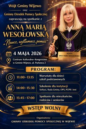 | Miejscowość: Wijewo Miejsce: Centrum Kulturalno-Kongresowe w Gminie Wijewo (ul. Parkowa 2) Data rozpoczęcia: 04.05.2026 11:00:00 Data zakończenia: 04.05.2026 17:00:00 Organizator: Wójt Gminy Wijewo oraz Gminny Ośrodek Pomocy Społecznej w Wijewie Opis wydarzenia: Zapraszamy na wyjątkowe spotkanie! Wójt Gminy Wijewo oraz Gminny Ośrodek Pomocy Społecznej w Wijewie zapraszają mieszkańców na spotkanie z sędzią Anną Marią Wesołowską pod hasłem: „Naucz, wytłumacz, pomóż” Kiedy? 4 maja 2026 r. Gdzie? Centrum Kulturalno-Kongresowe w Gminie Wijewo (ul. Parkowa 2) PROGRAM: 11:00–13:15 - Warsztaty dla dzieci szkół podstawowych 14:00–15:30 - Szkolenie dla instytucji (sołtysi, Rada Gminy, OPS, PCPR i inni) 15:45–17:00 - Spotkanie dla mieszkańców, rodziców i seniorów WSTĘP WOLNY! To doskonała okazja, aby zdobyć cenną wiedzę, porozmawiać o bezpieczeństwie i wychowaniu oraz zadać pytania ekspertowi. Serdecznie zapraszamy! |