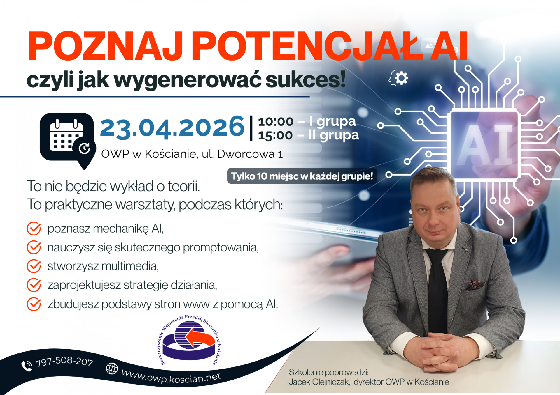| Miejscowość: Kościan Miejsce: Ośrodek Wspierania Przedsiębiorczości w Kościanie, ul. Dworcowa 1 Data rozpoczęcia: 23.04.2026 10:00:00 Data zakończenia: 23.04.2026 12:30:00 Organizator: Stowarzyszenie Wspierania Przedsiębiorczości w Kościanie Opis wydarzenia: Stowarzyszenie Wspierania Przedsiębiorczości w Kościanie zaprasza na warsztaty zarówno osoby początkujące, które dopiero zaczynają pracę z AI, jak i tych, którzy chcą uporządkować wiedzę i nauczyć się wykorzystywać jej potencjał w bardziej świadomy i efektywny sposób. Podczas warsztatów: • zrozumiesz mechanikę działania AI – czym są tokeny, okno kontekstowe i halucynacje, • nauczysz się projektować strategie – od analizy danych po gotowy plan działania, • stworzysz multimedia – grafiki i wideo w kilka minut, • poznasz podstawy tworzenia stron internetowych z pomocą AI, • opanujesz sztukę promptowania – skutecznego formułowania poleceń, • odkryjesz narzędzia zwiększające efektywność pracy. Spotkanie ma charakter warsztatowy, prosimy o zabranie własnego laptopa. Wymagany jest dostęp do modelu Gemini od Google. Ważne! Do wyboru dwie grupy: Grupa I, godz. 10:00–12:30 lub Grupa II, godz. 15:00–17:30. Osoby zainteresowane udziałem prosimy o wypełnienie formularza zgłoszeniowego do 21.04.2026 r. Liczba miejsc ograniczona, decyduje kolejność zgłoszeń!!! Więcej informacji na stronie www.owp.koscian.net oraz pod nr tel. 797 508 207. Zapraszamy! |