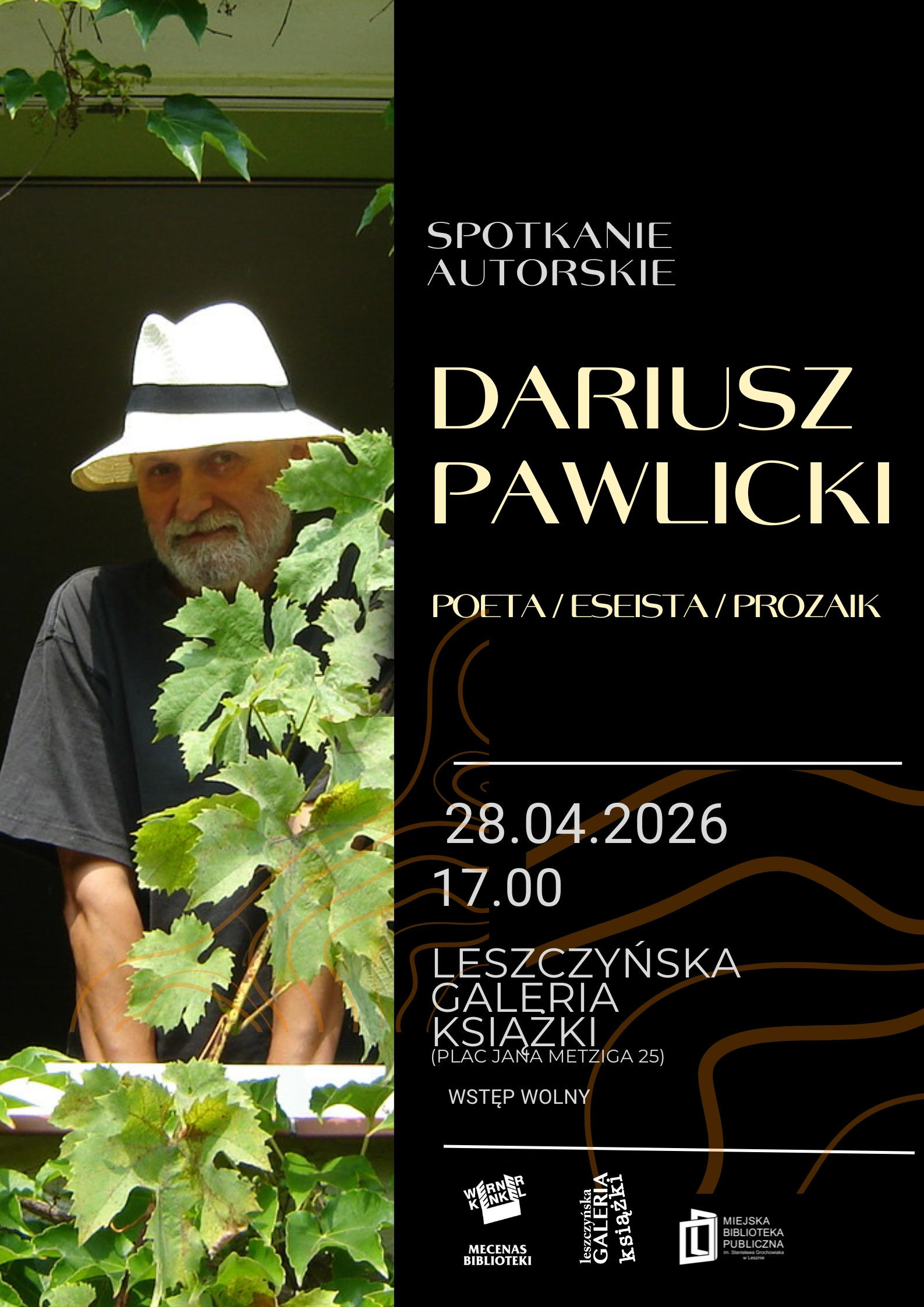 | Miejscowość: Leszno Miejsce: Leszczyńska Galeria Książki (Plac Jana Metziga 25) Data rozpoczęcia: 28.04.2026 17:00:00 Data zakończenia: 28.04.2026 18:00:00 Organizator: MBP Leszno Opis wydarzenia: 28 kwietnia 2026 r. o 17:00 w Leszczyńskiej Galerii Książki (Plac Jana Metziga 25) odbędzie się spotkanie autorskie z Dariuszem Pawlickim - twórcą, który porusza się swobodnie między esejem, poezją i prozą, a literaturę traktuje jak przestrzeń uważnej obserwacji świata i człowieka. Wstęp wolny. Dariusz Pawlicki (ur. 1961) jest autorem sześciu książek eseistycznych, m.in. „Chwile Miejsca Nastroje”, „Zauważenia”, „Fragmentaria”, „Przypomnienia. 12 esejów & szkiców”, „Glosariusz. 118 głos” oraz „Sytuacje & Postacie”. Wydał również zbiory wierszy, w tym „Haiku” i „48 wierszy”, a także książkę dla dzieci „Bibikin w drodze do Kamienia Życia”. Jego teksty ukazywały się m.in. w „Borussii”, „Gazecie Kulturalnej”, „Migotaniach”, „Pisarzach.pl”, „POEZJI dzisiaj” i „Twórczości”. Jest także autorem 100 haseł w „Encyklopedii Wrocławia”. Prowadził warsztaty poetyckie i literackie w bibliotekach oraz domach kultury, a także wygłaszał odczyty poświęcone literaturze i sztuce w wielu ośrodkach w Polsce, m.in. w Książnicy Karkonoskiej, Muzeum im. Anny i Jarosława Iwaszkiewiczów w Podkowie Leśnej oraz na Uniwersytetach Trzeciego Wieku. Absolwent Uniwersytetu Wrocławskiego (bibliotekoznawstwo i informacja naukowa), od 2001 roku należy do Związku Literatów Polskich. Związany emocjonalnie i rodzinnie z Suwalszczyzną oraz Wielkopolską. Zapraszamy na spotkanie wszystkich, którzy lubią literaturę refleksyjną, uważną i nieoczywistą - będzie okazja do rozmowy, zadawania pytań i bliższego poznania twórczości autora. |