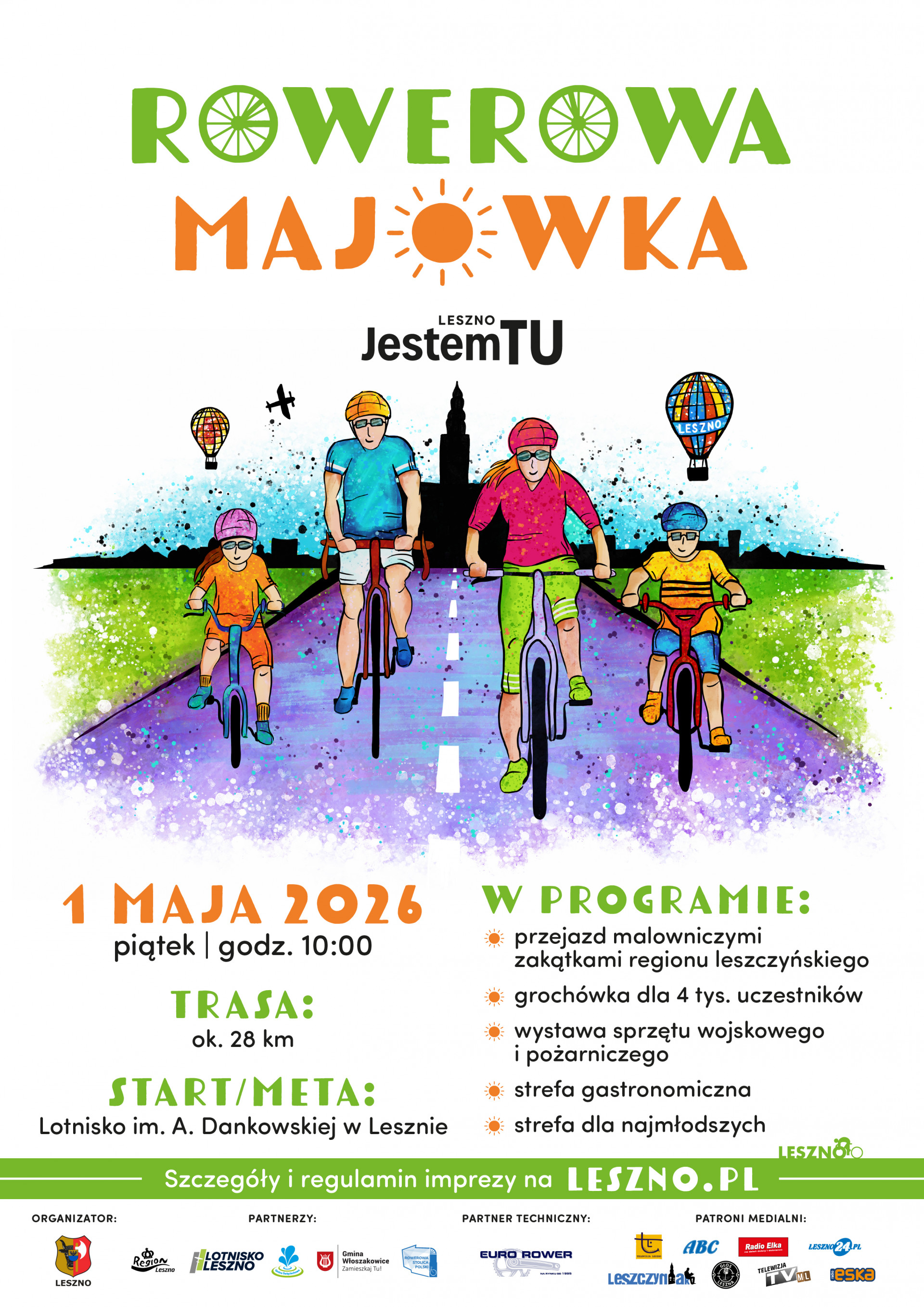 | Miejscowość: Leszno Miejsce: Lotnisko im. Adeli Dankowskiej w Lesznie Data rozpoczęcia: 01.05.2026 10:00:00 Data zakończenia: 01.05.2026 15:00:00 Organizator: Miasto Leszno Opis wydarzenia: Miejscowość: Leszno Miejsce: Lotnisko im. Adeli Dankowskiej w Lesznie, wjazd od ul. Kosmonautów Data rozpoczęcia: 2026-05-01 10.00 Data zakończenia: 2026-05-01 Miasto Leszno zaprasza wszystkich miłośników turystyki rowerowej na niezapomnianą przygodę podczas Rowerowej Majówki, która odbędzie się 1 maja 2026 r. Start o godz.10.00 z terenu Lotniska im. Adeli Dankowskiej w Lesznie - wjazd od ul. Kosmonautów. Start i meta rajdu będą miały miejsce na Lotnisku w Lesznie, skąd uczestnicy wyruszą na trasę liczącą około 28 kilometrów. Przejeżdżając przez malownicze tereny Leszna, Święciechowy, Piotrowic, Niechłodu, Zbarzewa, Jezierzyc Kościelnych i Gołanic, rowerzyści będą mieli okazję poznać piękno regionu leszczyńskiego. Organizator zapewnia uczestnikom nie tylko wspaniałe wrażenia, ale także poczęstunek dla 4 tys. uczestników oraz zabezpieczenie techniczne trasy i opiekę medyczną. Dodatkowo na mecie będzie można podziwiać wystawę sprzętu wojskowego i pożarniczego. Nie zabraknie także stref gastronomicznych oraz stref dla najmłodszych z dmuchańcami. Przypominamy, że uczestnictwo w rajdzie wymaga akceptacji regulaminu, który można znaleźć na stronie www.lesznoregion.pl oraz w biurze Centrum Informacji Turystycznej (ul. Słowiańska 24). Dbając o bezpieczeństwo wszystkich uczestników, prosimy o przestrzeganie zasad bezpieczeństwa drogowego oraz o troskę o środowisko naturalne. Unikajmy zanieczyszczania terenu i pozostawiania śmieci na trasie. Dołącz do naszego rowerowego świętowania w Lesznie i przeżyj niezapomniane chwile podczas Rajdu Rowerowego „Rowerowa Majówka”! |