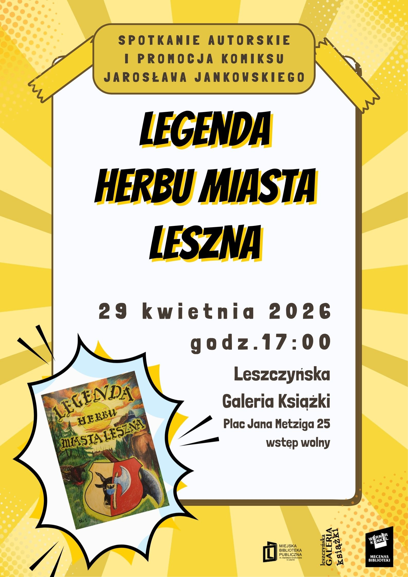 | Miejscowość: Leszno Miejsce: Leszczyńska Galeria Książki (Plac Jana Metziga 25) Data rozpoczęcia: 29.04.2026 17:00:00 Data zakończenia: 29.04.2026 18:00:00 Organizator: MBP Leszno Opis wydarzenia: Zapraszamy na spotkanie z Jarosławem Jankowskim, autorem komiksu „Legenda herbu Miasta Leszna”, który w barwny i przystępny sposób opowiada historię rycerza Filipa Wieniawity. Według podania w 965 roku ocalił on Dobrawę, żonę Mieszka I, przed dzikim turem, a w nagrodę otrzymał ziemie, na których powstało miasto. To opowieść, w której historia spotyka się z legendą, a symbol herbu nabiera zupełnie nowego znaczenia. Na promocję komiksu zapraszamy 29 kwietnia 2026 o godz. 17:00 do Leszczyńskiej Galerii Książki (Plac Jana Metziga 25). Wstęp wolny. To wydarzenie dla wszystkich - dzieci, młodzieży i dorosłych. Idealna okazja, żeby przyjść całą rodziną, posłuchać ciekawej historii i odkryć lokalne wątki w nowej, komiksowej odsłonie. Będzie też szansa, żeby zajrzeć za kulisy powstawania książki i spotkać autora, który potrafi opowiadać o przeszłości tak, że trudno się oderwać. Jarosław Jankowski to kustosz Muzeum Młynarstwa i Rolnictwa w Osiecznej oraz jeden z nielicznych w Polsce praktyków zajmujących się budową i ratowaniem zabytkowych wiatraków i młynów wodnych. Autor licznych publikacji, twórca „Wielkopolskiego Szlaku Wiatracznego” i inicjator wielu działań na rzecz ochrony dziedzictwa. Człowiek, który historię zna nie tylko z książek. |