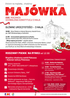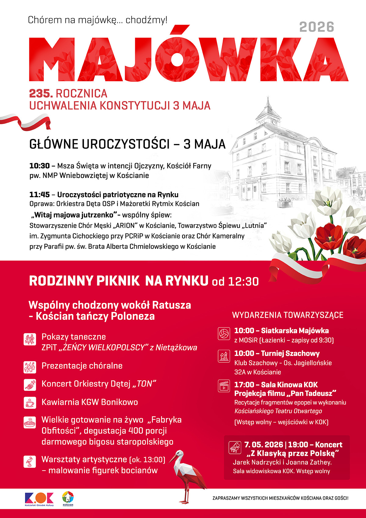 | Miejscowość: Kościan Miejsce: Rynek Kościan Data rozpoczęcia: 03.05.2026 11:45:00 Data zakończenia: 03.05.2026 15:00:00 Organizator: Kościański Ośrodek Kultury, Miasto Kościan Opis wydarzenia: Maj - Chórem na majówkę... chodźmy! Majowe święta w Kościanie to nie tylko czas odpoczynku, ale przede wszystkim wyjątkowa okazja do zamanifestowania patriotyzmu i przywiązania do narodowych tradycji. Tegoroczny program łączy w sobie powagę uroczystości państwowych z bogatą ofertą kulturalną i sportową, dzięki czemu każdy mieszkaniec znajdzie sposób na aktywne i godne uczczenie historycznego aktu z 1791 roku. Od uroczystego nabożeństwa, rodzinny piknik na Rynku, turniej szachowy aż po siatkarską majówkę na Łazienkach – Kościan staje się w te dni centrum lokalnej tożsamości. Zapraszamy do udziału w obchodach 235. rocznicy uchwalenia Konstytucji 3 Maja w Kościanie oraz do zapoznania się z przygotowanym programem. Główne uroczystości rocznicowe 3 maja Centralne punkty obchodów skupiają się na upamiętnieniu twórców pierwszej w Europie nowoczesnej ustawy zasadniczej. Wydarzenia te mają charakter oficjalny i podniosły, a ich oprawę uświetnią lokalne instytucje oraz Orkiestra Dęta OSP w Kościanie. 10:30 – Msza Święta w intencji Ojczyzny sprawowana w Kościele Farnym pw. NMP Wniebowziętej w Kościanie. 11:45 – Uroczystości patriotyczne na Rynku, obejmujące złożenie wiązanek kwiatów pod tablicami pamiątkowymi przy akompaniamencie Orkiestry Dętej OSP i występie Mażoretek Rytmix Kościan. 12:00 - Kościan tańczy Poloneza – wspólny chodzony wokół Ratusza oraz Polskich Tradycji - więcej informacji tutaj » 12:00 - Rodzinny Piknik na Kościańskim Rynku Piknik na Kościańskim Rynku – wspólne świętowanie pełne tradycji i radości Już wkrótce kościański Rynek wypełni się muzyką, tańcem, zapachem tradycyjnych potraw i twórczą energią mieszkańców! Zapraszamy na wyjątkowy piknik na rynku, który rozpocznie się około godziny 12:00 – tuż po zakończeniu uroczystości oficjalnych. Kościan tańczy Poloneza Centralnym punktem wydarzenia będzie wspólne wykonanie poloneza – dostojnego, a zarazem integrującego tańca narodowego. Zapraszamy wszystkich mieszkańców do udziału w tym wyjątkowym „chodzonym” wokół Ratusza. Taniec poprowadzi młodzież, a dołączyć może każdy – bez względu na wiek czy doświadczenie. Wspólnie stworzymy piękny obraz jedności i przywiązania do polskich tradycji. Muzycznie Koncert Orkiestry Dętej „TON" i wokalnie – pieśni, które łączą Na scenie zabrzmią występy lokalnych chórów. W ich wykonaniu usłyszymy m.in. „Witaj majowa jutrzenko” – utwór symbolizujący odrodzenie, wspólnotę i radość bycia razem. Wystąpią: -Stowarzyszenie Chór Męski „ARION” w Kościanie -Towarzystwo Śpiewu „Lutnia” im. Zygmunta Cichockiego przy Powiatowym Cechu Rzemiosł i Przedsiębiorczości w Kościanie -Chór Kameralny przy Parafii pw. św. Brata Alberta -Chmielowskiego w Kościanie Tanecznie – tradycja w ruchu Oprócz wspólnego poloneza na uczestników czekają także: -prezentacje taneczne młodzieży z klas ósmych i maturzystów podczas Poloneza, -barwne występy w tradycyjnych strojach, pokaz ZPiT „Żeńcy Wielkopolscy" z Nietążkowa, który ożywi scenę energią i folklorem, -Ożywione – pokaz mody w spódnicach poMalowanych podczas artystycznych warsztatów. Kulinarnie – uczta dla podniebienia Nie zabraknie również smaków, które kojarzą się z polską tradycją, a Fabryka Obfitości przygotuje aż 400 porcji staropolskiego bigosu – degustacja będzie bezpłatna! -gotowanie na żywo na OGROMNEJ patelni stanie się prawdziwym kulinarnym show, w bigosie znajdą się m.in. kapusta, dziczyzna, grzyby, śliwki, miód i powidła – prawdziwa uczta dla smakoszy. Kreatywnie – coś dla najmłodszych (i nie tylko!) Od około godziny 12:45 do 15:00 zapraszamy na warsztaty artystyczne. Uczestnicy będą mogli: -pomalować figurki bocianów, -ubrać je w barwy narodowe, -zabrać swoje dzieło do domu na pamiątkę. To doskonała okazja do wspólnego spędzenia czasu – dzieci tworzą, a dorośli pomagają i kibicują Filmowo – klasyka w KOK Na zakończenie dnia, na 17:00 zapraszamy do sali kinowej w KOK na projekcję filmu Andrzeja Wajdy „Pan Tadeusz”. Wstęp jest wolny – bezpłatne wejściówki czekają do odbioru w Kościańskim Ośrodku Kultury. Teatralnie – klasyka polskiej literatury w sali kinowej KOK W programie znajdą się również krótkie recytacje fragmentów „Pana Tadeusza" – ponadczasowego dzieła, które doskonale wpisuje się w klimat wspólnego świętowania i pielęgnowania narodowej tradycji. Te teatralne akcenty, pozwalające na chwilę zatrzymać się i wsłuchać w piękno polskiego słowa, zaprezentują aktorzy Kościańskiego Teatru Otwartego (Teatr KTO) pod kierunkiem reżysera Mikołaja Troszczyńskiego. Piknik na Kościańskim Rynku to wydarzenie, które łączy pokolenia – pełne muzyki, tańca, tradycji i wspólnej radości. Przyjdź, zatańcz, zaśpiewaj, spróbuj i twórz razem z nami! Do zobaczenia na Rynku! Wydarzenia towarzyszące i sportowe Majówka w Kościanie to także szereg atrakcji rozrywkowych i sportowych rozciągniętych na cały długi weekend. Program został skonstruowany tak, aby angażować różne grupy wiekowe, od dzieci biorących udział w warsztatach, po pasjonatów szachów. 3 maja – Dzień Konstytucji to także czas na sportową rywalizację i sąsiedzkie spotkania 10:00 – Siatkarska majówka na Łazienkach - Start o 10:00, zapisy od godz. 9.30 lub w biurze MOSIR Kościan 10:00 – Turniej Szachowy dla mieszkańców Kościana i okolic w Klubie Szachowym przy Osiedlu Jagiellońskim 32A (UKS KSM Tęcza Kościan) 7 maja, o godz.: 19:00 - Koncert „Z Klasyką przez Polskę" Jarek Nadrzycki - skrzypce i Joanna Zathey - fortepian. Sala widowiskowa KOK. Wstęp wolny