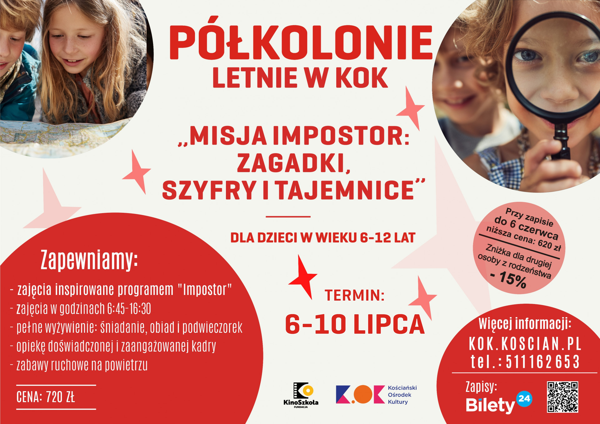 | Miejscowość: Kościan Miejsce: KOK, ul. Mickiewicza 11 Data rozpoczęcia: 06.07.2026 06:45:00 Data zakończenia: 10.07.2026 16:30:00 Organizator: Kościański Ośrodek Kultury, Fundacja Kino Szkoła Opis wydarzenia: MISJA IMPOSTOR zagadki, szyfry i tajemnice Półkolonie letnie w Kościańskim Ośrodku Kultury Zapraszamy dzieci w wieku 6–12 lat na wyjątkową, pełną emocji przygodę inspirowaną popularnym programem Impostor z YouTube! Uczestnicy wcielą się w członków załogi, którzy będą musieli rozwiązywać zagadki, łamać szyfry i odkrywać tajemnice… jednocześnie próbując ustalić, kto jest tytułowym impostorem czyli sabotażystą utrudniającym pracę. Podczas pięciu dni półkolonii dzieci wezmą udział w angażującej fabule, w której każdy dzień to nowa misja: - rekrutacja do załogi i pierwsze wyzwania, - nauka szyfrów (alfabet Morse’a, szyfry, tajne wiadomości), - eksperymenty i zajęcia kreatywne (m.in. „kosmiczny slime”, analiza śladów), - wielka gra terenowa „Kto jest impostorem?”, Program łączy warsztaty plastyczno-techniczne, rozwijające kreatywność i logiczne myślenie, z grami i zabawami sprawnościowymi na świeżym powietrzu, które dostarczą mnóstwo ruchu i dobrej zabawy. Zapewniamy: opiekę w godzinach 6:45–16:30, pełne wyżywienie (śniadanie, obiad, podwieczorek), bogaty i różnorodny program zajęć, niezapomnianą atmosferę przygody i współpracy. doświadczoną i zaangażowaną kadrę animatorów z Fundacji KinoSzkoła 6-10 lipca 2026 r. od godz. 6:45 do 16:30 Zapisy: https://kok-koscian.bilety24.pl Koszt: - wpłaty do 6 czerwca 2026 r.: 620 zł za osobę, zniżka dla drugiej osoby z rodzeństwa 15%! (620,00 zł + 527,00 zł) - wpłaty po 6 czerwca 2026 r.: 720 zł za osobę, zniżka dla drugiej osoby z rodzeństwa 15%! (720,00 zł + 612,00 zł) Zapraszamy do zapisów. Więcej informacji: 511 162 653 Zarezerwuj miejsce dla swojego dziecka już dziś! Dołącz do misji i sprawdź, czy potrafisz odkryć impostora, zanim będzie za późno! |