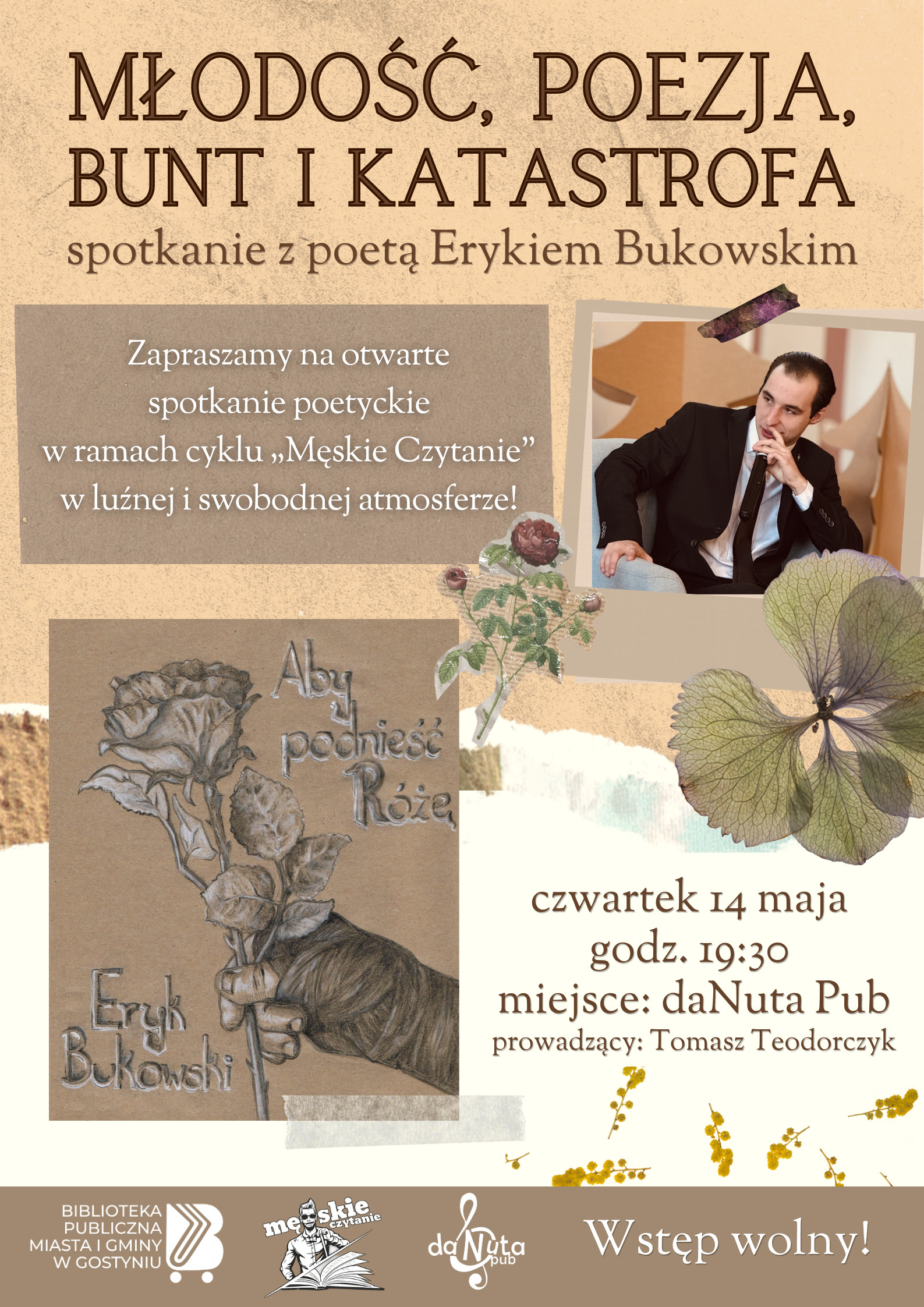 | Miejscowość: Gostyń Miejsce: Biblioteka w Gostyniu Data rozpoczęcia: 14.05.2026 19:30:00 Data zakończenia: 14.05.2026 20:30:00 Organizator: Biblioteka Publiczna Miasta i Gminy w Gostyniu Opis wydarzenia: Młodość, poezja, bunt i katastrofa. Spotkanie z poetą Erykiem Bukowskim w ramach „Męskiego Czytania” Data: czwartek 14 maja 2026 r. Godzina: 19:30 Miejsce: daNuta Pub przy targowisku w Gostyniu Przed nami kolejne spotkanie w ramach cyklu Męskie Czytanie – spotkań poświęconych literaturze i nie tylko, organizowanych w luźnej, swobodnej atmosferze. Tym razem gościem będzie młody gostyński poeta Eryk Bukowski, który zaprezentuje swoją najnowszą twórczość oraz opowie o pracy nad tomikiem „Aby podnieść Różę”. Spotkanie, które odbędzie sięw czwartek 14 maja o 19:30 w daNuta Pub będzie okazją do rozmowy o młodości, ambicji i poszukiwaniu własnego głosu w poezji. Twórczość autora wyrasta z fascynacji tradycją „Sztuki i Narodu” oraz II Awangardy, jednak nie ma charakteru jedynie odtwórczego – stanowi próbę zmierzenia się z dziedzictwem poprzednich pokoleń i nadania mu współczesnego, osobistego wymiaru. W jego tekstach pojawiają się zarówno odniesienia historyczne, jak i autorskie, często zaskakujące postacie i obrazy, łączące w sobie elementy realizmu, surrealizmu i katastrofizmu. Jak sam podkreśla, jego nowy tomik to projekt odważny i ryzykowny – próba dialogu z twórcami, którzy w młodym wieku podejmowali najważniejsze pytania o sens, odpowiedzialność i rolę sztuki. To także opowieść o potrzebie ciągłości międzypokoleniowej i o tym, czy dziś wciąż można mówić o wspólnocie idei w poezji. W trakcie spotkania usłyszymy fragmenty tekstów, porozmawiamy o inspiracjach, procesie twórczym oraz o tym, czym jest pisanie „tu i teraz”. Nie zabraknie również przestrzeni na pytania i otwartą dyskusję. Spotkanie poprowadzi Tomasz Teodorczyk. Eryk Bukowski – urodzony w Gostyniu poeta. Działacz Młodzieży Wszechpolskiej. Były zawodnik Sportów Walki Gostyń, nadal związany z zainteresowaniem pięściarstwem. Do jego głównych zainteresowań należą boks, poezja, polityka (w szczególności kulturalna i społeczna), filozofia polityki, etyka oraz metafizyka. Twórczość poetycka Bukowskiego reprezentuje nurty katastrofizmu oraz neosurrealizmu. |