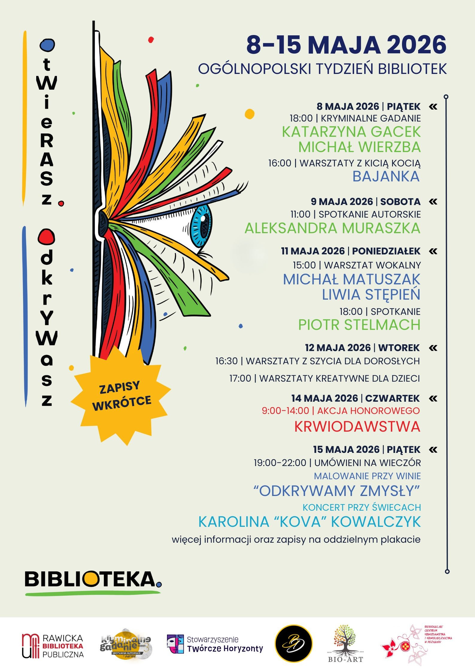 | Miejscowość: Rawicz Miejsce: Rawicka Biblioteka Publiczna ul. Szarych Szeregów 3, Rawicz 63-900 Data rozpoczęcia: 08.05.2026 18:00:00 Data zakończenia: 15.05.2026 22:00:00 Organizator: Rawicka Biblioteka Publiczna Opis wydarzenia: Ogólnopolski Tydzień Bibliotek Serdecznie zapraszamy w dniach 8-15 maja 2026 W programie: DLA DZIECI: - Zajęcia z Kicią Kocią, prowadzone przez uwielbianą przez dzieci Bajanka (3-6 lat) - Warsztaty plastyczne z bibliotekarkami (7-10 lat) DLA MŁODYCH: - Warsztat wokalny z Michałem Matuszakiem i Liwią Stępień z BruDolina Studios (13-20 lat) - Spotkanie autorskie z Aleksandra Muraszka- strona autorska (wiek dowolny) DLA DOROSŁYCH: - Kryminalne gadanie z Katarzyną Gacek i Michałem Wierzbą - Męskie rozmowy nie tylko dla mężczyzn - rozmowa z Piotr Stelmach, prowadzona przez Mateusza Fusiarza - Warsztaty z szycia (20+) - Akcja Honorowego Krwiodawstwa - Spotkanie z cyklu „Umówieni na Wieczór” (szczegóły wkrótce na oddzielnym plakacie) Do zobaczenia w bibliotece! Więcej szczegółów na naszej stronie www.rbp.rawicz.pl |