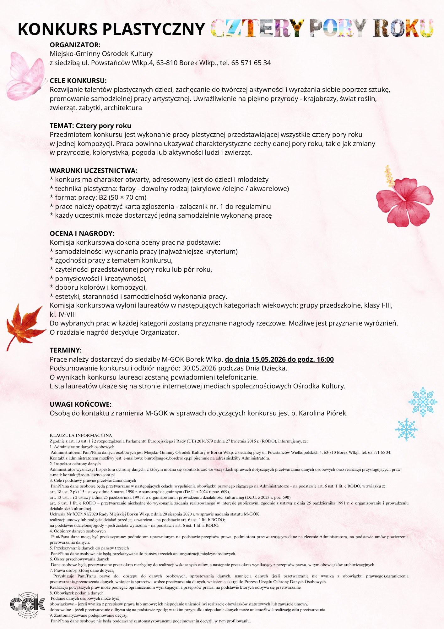 | Miejscowość: Borek Wielkopolski Miejsce: M-GOK Borek Wlkp. Data rozpoczęcia: 27.04.2026 15:00:00 Data zakończenia: 15.05.2026 16:00:00 Organizator: Miejsko-Gminny Ośrodek Kultury w Borku Wlkp. Opis wydarzenia: Zapraszamydo udziału w konkursie plastycznym „Cztery pory roku" To świetny moment, żeby chwycić za farby i puścić wodze wyobraźni. Szczegóły znajdziecie w regulaminie – dołączcie i twórzcie razem z nami! Regulamin na stronie: www.mgok.borekwlkp.pl |