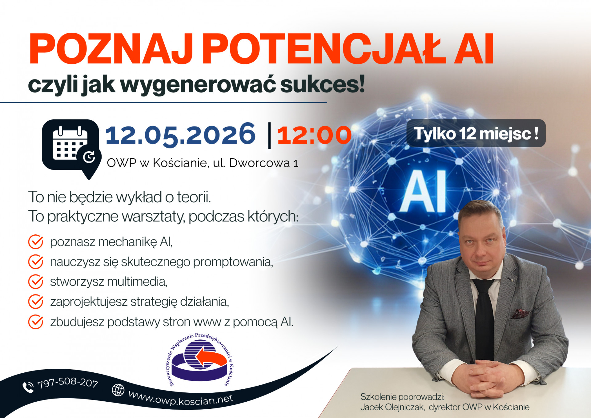 | Miejscowość: Kościan Miejsce: Ośrodek Wspierania Przedsiębiorczości w Kościanie, ul. Dworcowa 1 Data rozpoczęcia: 12.05.2026 12:00:00 Data zakończenia: 12.05.2026 14:30:00 Organizator: Stowarzyszenie Wspierania Przedsiębiorczości w Kościanie Opis wydarzenia: Zapraszamy zarówno osoby początkujące, które dopiero zaczynają pracę z AI, jak i tych, którzy chcą uporządkować wiedzę i nauczyć się wykorzystywać jej potencjał w bardziej świadomy i efektywny sposób. Podczas warsztatów: - zrozumiesz mechanikę działania AI – czym są tokeny, okno kontekstowe i halucynacje, - nauczysz się projektować strategie – od analizy danych po gotowy plan działania, - stworzysz multimedia – grafiki i wideo w kilka minut, - poznasz podstawy tworzenia stron internetowych z pomocą AI, - opanujesz sztukę promptowania – skutecznego formułowania poleceń, - odkryjesz narzędzia zwiększające efektywność pracy. Prowadzący: Jacek Olejniczak, dyrektor Ośrodka Wspierania Przedsiębiorczości w Kościanie. Ważne! Osoby zainteresowane udziałem prosimy o wypełnienie formularza zgłoszeniowego do 11.05.2026 r. Liczba miejsc ograniczona, decyduje kolejność zgłoszeń!!! Więcej informacji na stronie www.owp.koscian.net oraz pod nr tel. 797 508 207. |