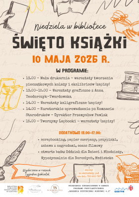 | Miejscowość: Gostyń Miejsce: Biblioteka w Gostyniu Data rozpoczęcia: 10.05.2026 13:00:00 Data zakończenia: 10.05.2026 17:00:00 Organizator: Biblioteka Publiczna Miasta i Gminy w Gostyniu Opis wydarzenia: Święto Książki w bibliotece Data: niedziela 10 maja 2026 r. Godzina: 13:00 - 17:00 Miejsce: Biblioteka Publiczna Miasta i Gminy w Gostyniu Już 10 maja 2026 zapraszamy do Biblioteki Publicznej Miasta i Gminy w Gostyniu na Święto Książki! To doskonała okazja, by spędzić dzień w inspirującym, literackim klimacie. W programie znalazło się wiele atrakcji rozwijających kreatywność i rozbudzających pasję do książek. O godzinie 13:00 rusza „Mała drukarnia” – warsztaty tworzenia pieczątkowych kolaży i ekslibrisów (zapisy). W tym samym czasie rozpoczną się otwarte warsztaty graficzne w Mediatece prowadzone przez Annę Teodorczyk-Twardowską (13:00–15:00). Na godzinę 14:00 zaplanowano zajęcia z kaligrafii (zapisy) oraz kuratorskie oprowadzanie po Komnacie Starodruków z dyrektorem BPMiG w Gostyniu, Przemysławem Pawlakiem. Z kolei o 15:00 uczestnicy będą mogli dać upust swojej sympatii do książek, tworząc literackie lapbooki (zapisy). Dodatkowo, w godzinach 13:00–17:00 dostępne będą liczne atrakcje towarzyszące, takie jak: scrapbooking, papier czerpany, przypinki, zabawy z nagrodami oraz seans filmowy. Otwarte będą również: Oddział dla Dzieci i Młodzieży, Wypożyczalnia dla Dorosłych oraz Mediateka. Warsztaty na zapisy pod nr tel.: 730 800 787 Wydarzenie odbywa się w ramach Tygodnia Bibliotek oraz programu profilaktycznego „Akademia Pożytecznej Rozrywki 4.0”. |