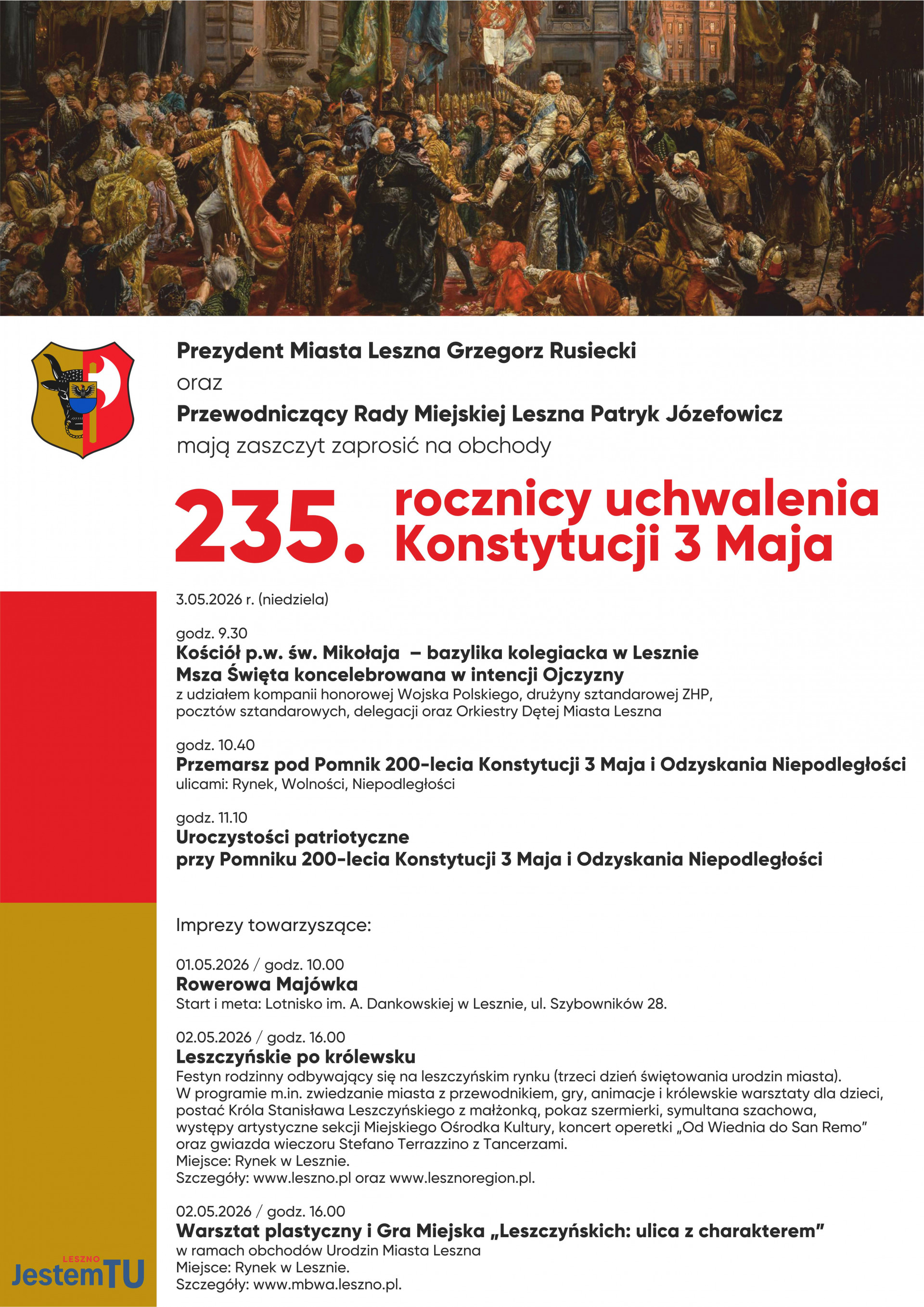 | Miejscowość: Leszno Miejsce: Pomnik 200-lecia Konstytucji 3 Maja i Odzyskania Niepodleglości Data rozpoczęcia: 03.05.2026 09:30:00 Data zakończenia: 03.05.2026 12:00:00 Organizator: Miasto Leszno Opis wydarzenia: godz. 9.30 Kościół p.w. św. Mikołaja – bazylika kolegiacka w Lesznie Msza Święta koncelebrowana w intencji Ojczyzny z udziałem kompanii honorowej Wojska Polskiego, drużyny sztandarowej ZHP, pocztów sztandarowych, delegacji oraz Orkiestry Dętej Miasta Leszna godz. 10.40 Przemarsz pod Pomnik 200-lecia Konstytucji 3 Maja i Odzyskania Niepodległości ulicami: Rynek, Wolności, Niepodległości godz. 11.10 Uroczystości patriotyczne przy Pomniku 200-lecia Konstytucji 3 Maja i Odzyskania Niepodległości |