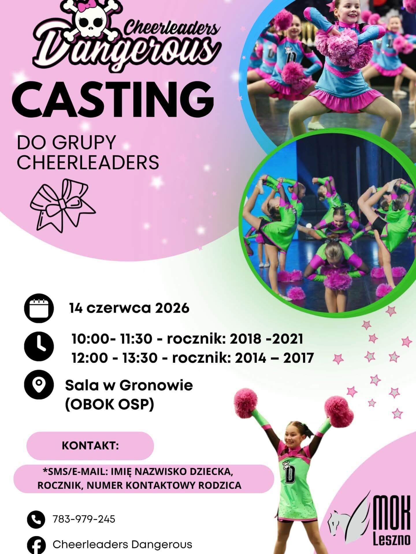| Miejscowość: Leszno Miejsce: Gronowo- sala przy OSP ul. Gronowska 56 Data rozpoczęcia: 14.06.2026 10:00:00 Data zakończenia: 14.06.2026 13:30:00 Organizator: Miejski Ośrodek Kultury- trenerka Natalia Rezner Opis wydarzenia: Dołącz do naszego zespołu i rozpocznij wyjątkową taneczną przygodę! NA CZYM POLEGA CASTING? To nie egzamin, ale spotkanie, podczas którego sprawdzimy: • predyspozycje taneczne, • sprawność ruchową, • energię, chęci i… uśmiech! Zajęcia będą miały formę treningu składającego się z rozgrzewki, tańca i rozciągania. Warto zabrać ze sobą: • wygodny strój sportowy, • wodę, • związane włosy. KOGO SZUKAMY? • Dzieci odważnych, energicznych i otwartych na nowe wyzwania, • Mali tancerze, którzy chcą nauczyć się czegoś nowego, • Przyszłe gwiazdy cheerleadingu KIM JESTEŚMY? Jesteśmy Zespołem Cheerleaders działającym przy Miejskim Ośrodku Kultury w Lesznie Nasze zawodniczki z grup turniejowych biorą udział w profesjonalnych turniejach w całej Polsce, rozwijając swoje umiejętności w atmosferze wsparcia, radości i sportowej pasji. Są tegorocznymi V-ce mistrzyniami Grand Prix Polski ! UWAGA! Jest możliwość natychmiastowego przejścia do grup turniejowych ZAPISY I KONTAKT: Nie zwlekaj – liczba miejsc ograniczona! Zgłoszenia i pytania przyjmujemy pod numerem ; NAPISZ WIADOMOŚĆ NA NASZEJ STRONIE LUB SMS O TREŚCI “CASTING DANGEROUS 2026, IMIĘ, NAZWISKO ORAZ ROCZNIK DZIECKA! 783-979-245 Facebook: Cheerleaders Dangerous Leszno Instagram: @cheerleadersdangerous Po castingu skontaktujemy się z Państwem przez wiadomość SMS. DOŁĄCZ DO NAS I ZACZNIJ SWOJĄ TANECZNĄ PRZYGODĘ JUŻ DZIŚ! |