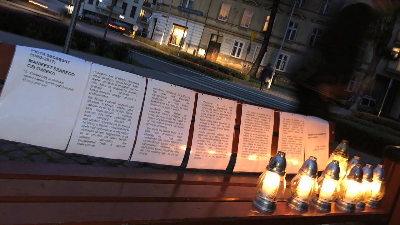 przez rząd PiS praw obywatelskich, rozrzucił też „Manifest”: przygotowywane od kilku miesięcy oświadczenie, w którym określił siebie jako „szarego człowieka”. Zarzucił w nim rządowi Prawa i Sprawiedliwości między innymi łamanie Konstytucji i zasad demokracji, niszczenie przyrody i używanie języka nienawiści w debacie publicznej.
