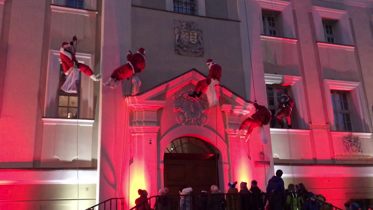 Święty Mikołaj, a ściślej mówiąc pięciu, spadło dziś z nieba na leszczyński Rynek. Postaci w czerwonych czapkach i kubrakach z hełmu ratusza, po linach zjechały na dół, by wywołać uśmiech na twarzach najmłodszych. Ich akrobacje i wygibasy oglądały tłumy mieszkańców.