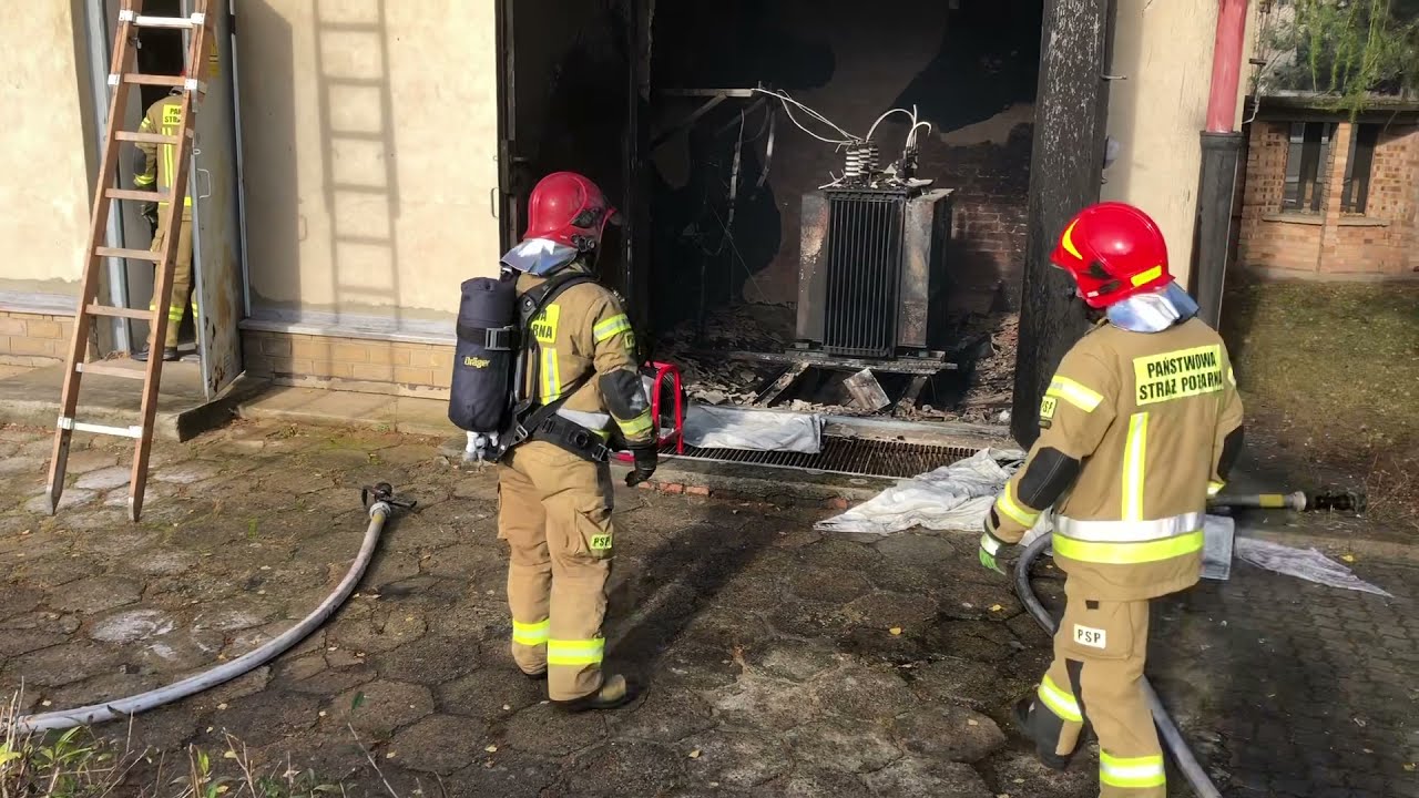 kolektora. W momencie jego załączenia doszło do wybuchu. Kolektor znajduje się w pomieszczeniu z transformatorem prądotwórczym. Ogień przeniósł się na transformator i zapalił się olej. Po przyjeździe na miejsce ogień wydobywał się z pomieszczenia. Na szczęście jest ono wydzielone w budynku zasilania energetycznego. Z racji, że jest w pełni zamurowane i nie ma okien, to ogień na szczęście nie rozprzestrzenił się na sąsiednie pomieszczenia. Strażacy przy użyciu kamery termowizyjnej sprawdzają jeszcze powierzchnię dachu, która kryta jest papą i eliminują miejsca potencjalnych źródeł ognia - mówi mł. kpt. Paweł Wolniczak, dowódca akcji.
