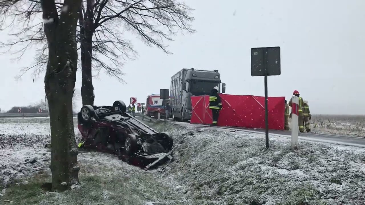 Na skutek zderzenia samochód osobowy wypadł z trasy i dachował. Autem podróżowały dwie kobiety, jedna z nich nie przeżyła wypadku.